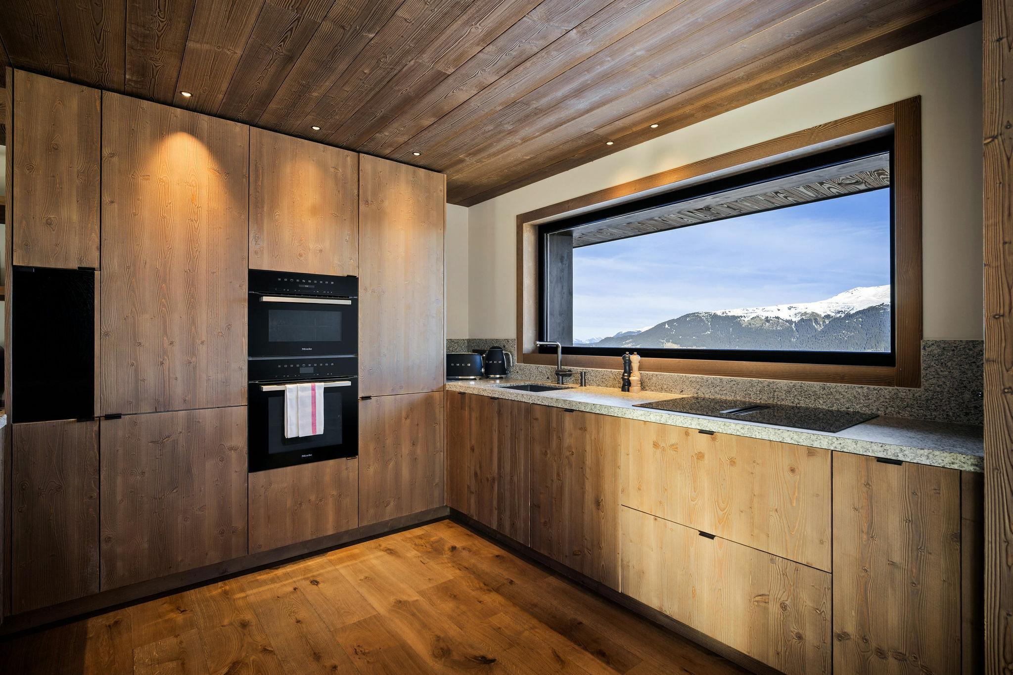 The living area has a comfy wrap-around sofa and armchairs, all of which are positioned beneath huge windows that let in plenty of natural light.