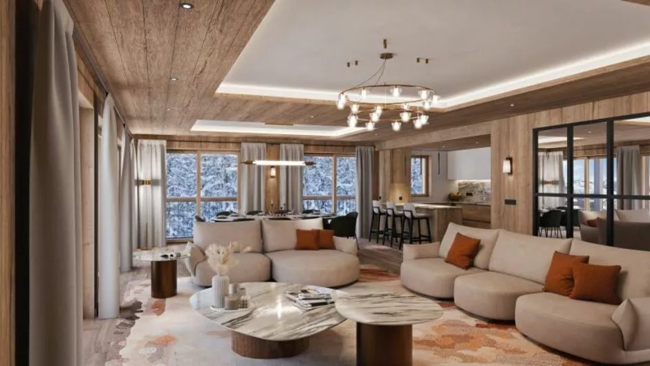 The apartment boasts an expansive open-concept living and dining space with comfortable seating and direct access to a private balcony, showcasing spectacular mountain views. A well-equipped kitchen connects to an open-plan dining space, perfect for shared evening meals. The apartment includes a dedicated television lounge, ideal for film screenings and a private sauna.