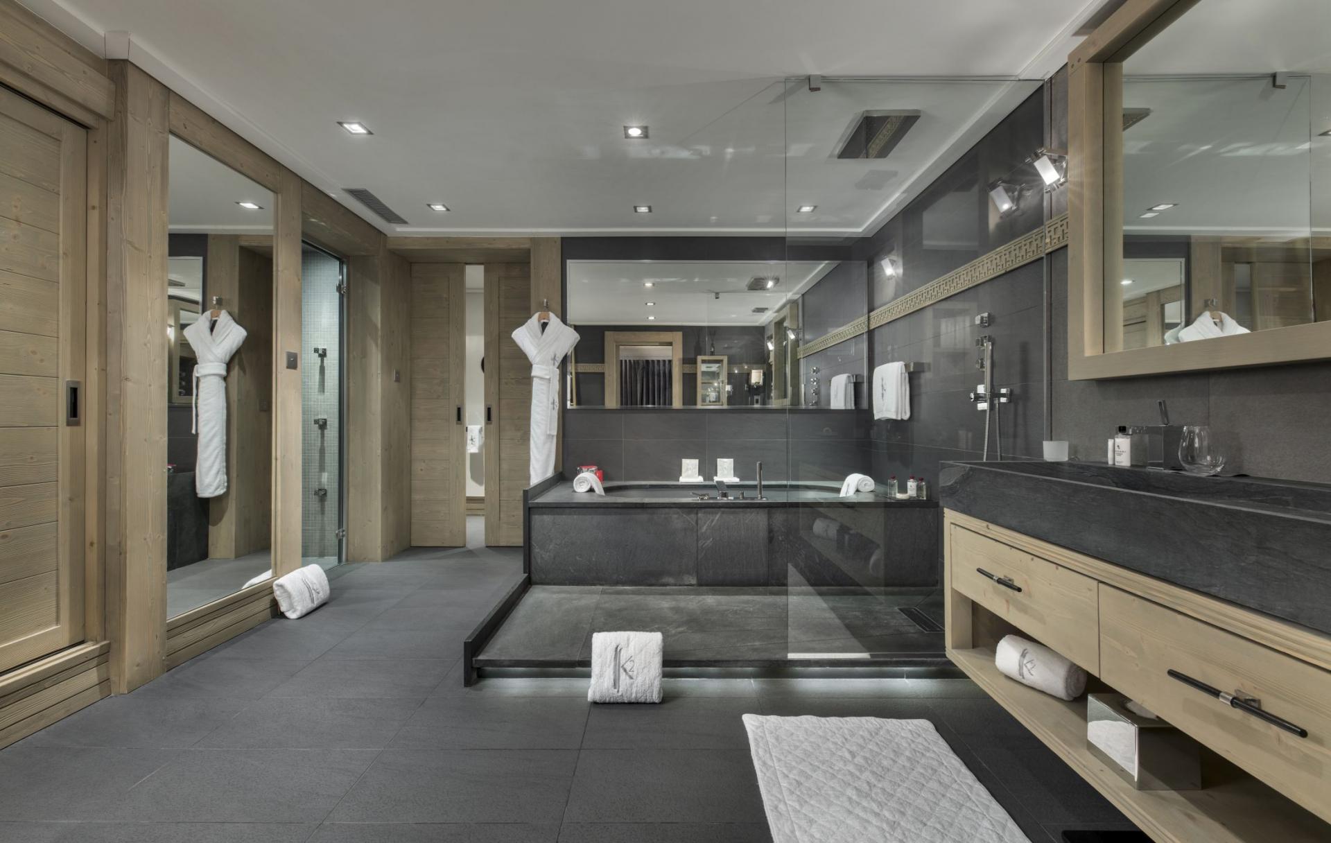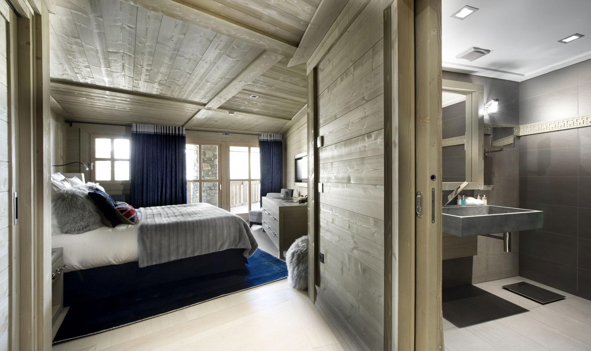 Chalet Abruzzes features seven double bedrooms, comfortably accommodating up to 14 guests. The sleeping quarters exemplify contemporary Alpine luxury, showcasing traditional wooden interiors, luxurious bedding, and abundant space, with select rooms incorporating dressing or sitting areas. The impressive Master suite, with its elevated ceilings, occupies the top floor, while 5 of the remaining 6 bedrooms are situated on the middle level. Six of the seven bedrooms provide access to shared balcony spaces, offering stunning mountain panoramas. Each bedroom boasts its own elegant en-suite bathroom, with the majority featuring both a bathtub and walk-in shower facilities.