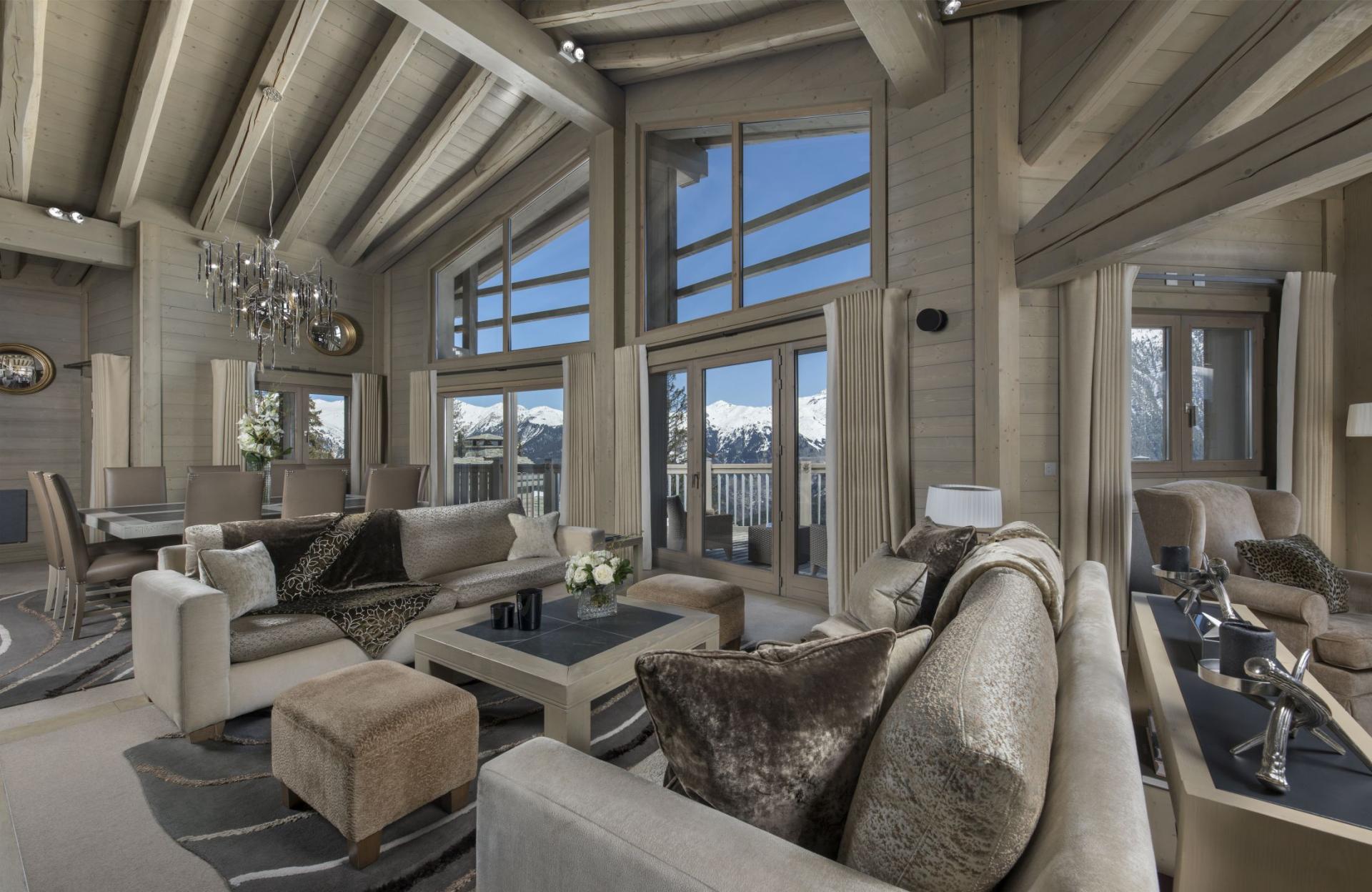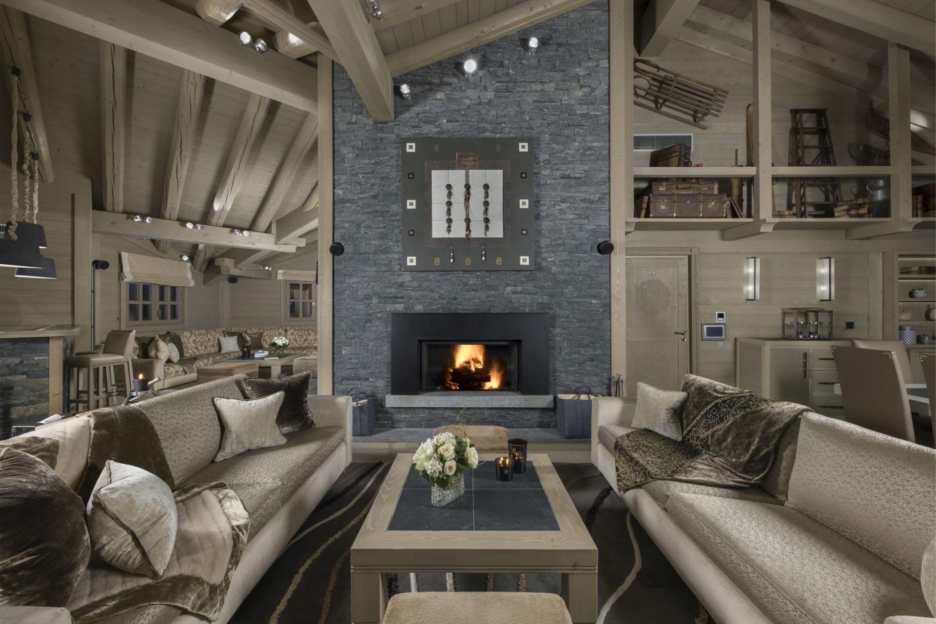 The chalet's primary living spaces are situated across three levels, with the main gathering areas located on the uppermost floor. The lofty ceilings crafted from light timber create an expansive, airy atmosphere, whilst sophisticated, neutral-toned furnishings lend an air of understated elegance. A stone hearth serves as the centrepiece of the main lounge, which flows seamlessly into an open-plan arrangement featuring a formal dining area and an intimate bar space. A secondary sitting area is discreetly positioned in the corner, providing additional comfortable seating for the chalet's 14 guests. The top level extends onto a spacious balcony, offering magnificent views across the valley and the Vanoise mountains, complete with plentiful outdoor seating for savouring the picturesque surroundings.
