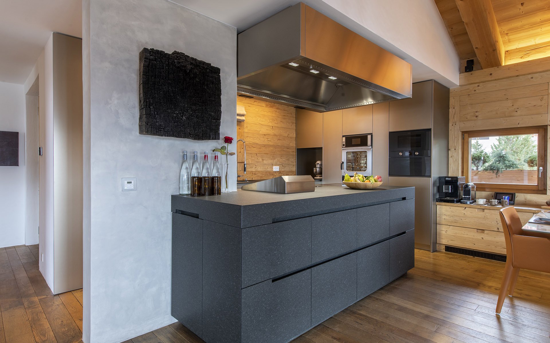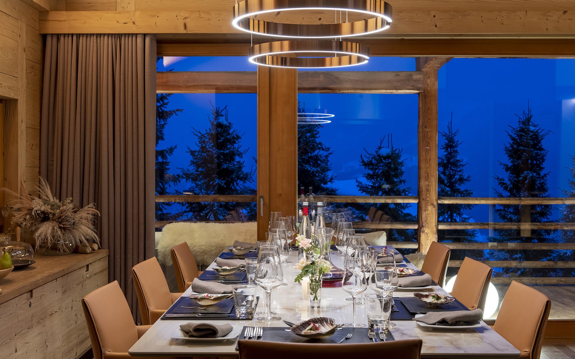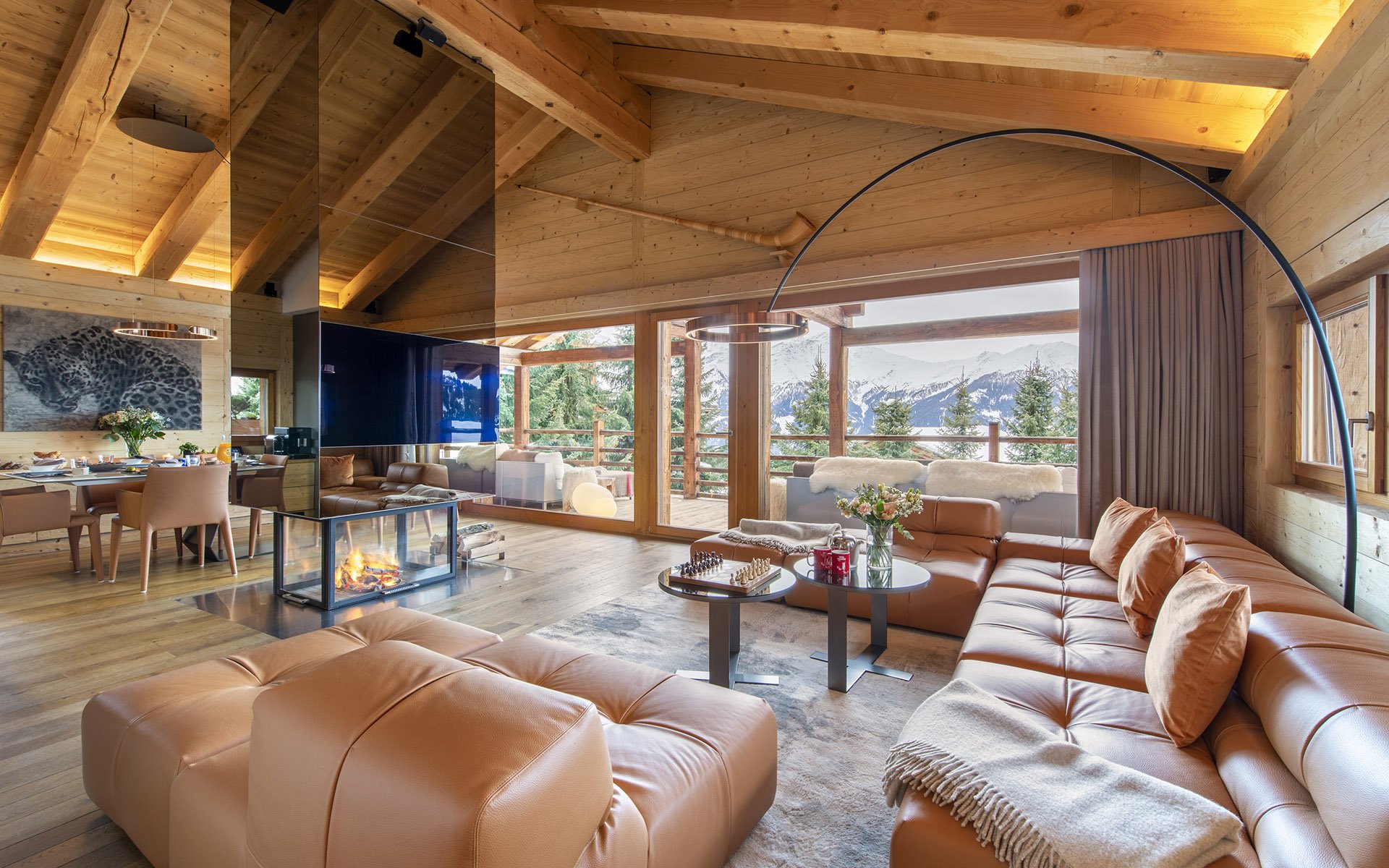 The living spaces within Chalet Belle Claire offer an idyllic setting for unwinding when not indulging in the wellness facilities. The second floor houses an open-plan arrangement comprising living, dining and kitchen areas, crowned with soaring vaulted ceilings. The interior showcases elegant light wood finishes throughout, complemented by sumptuous brown sofas and sophisticated furnishings, embodying the essence of modern alpine refinement. A contemporary mirrored fireplace serves as the room's centerpiece, offering a modern interpretation of the traditional hearth. The dining area comfortably accommodates all guests and is supported by a cutting-edge, fully equipped kitchen. Among Chalet Belle Claire’s numerous highlights are the magnificent views from the property. Stunning mountain panoramas unfold before you, visible through expansive glass windows or from the chalet's spacious balcony and terrace areas. Complete with cosy outdoor seating and dining spaces, plus an outdoor fireplace, this area provides the perfect setting for après-ski festivities.