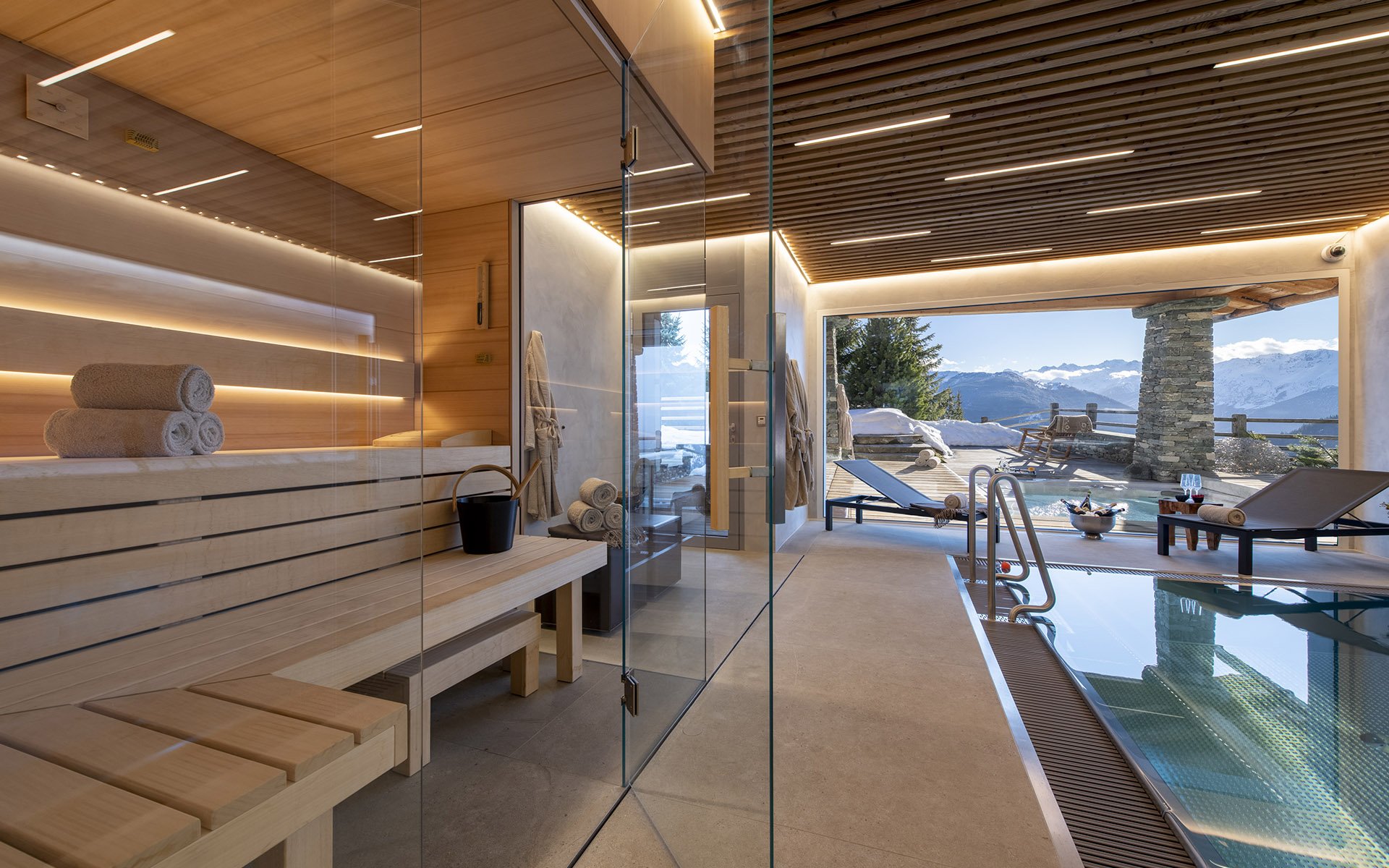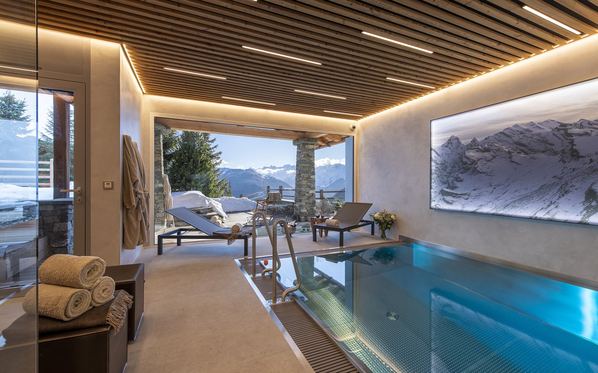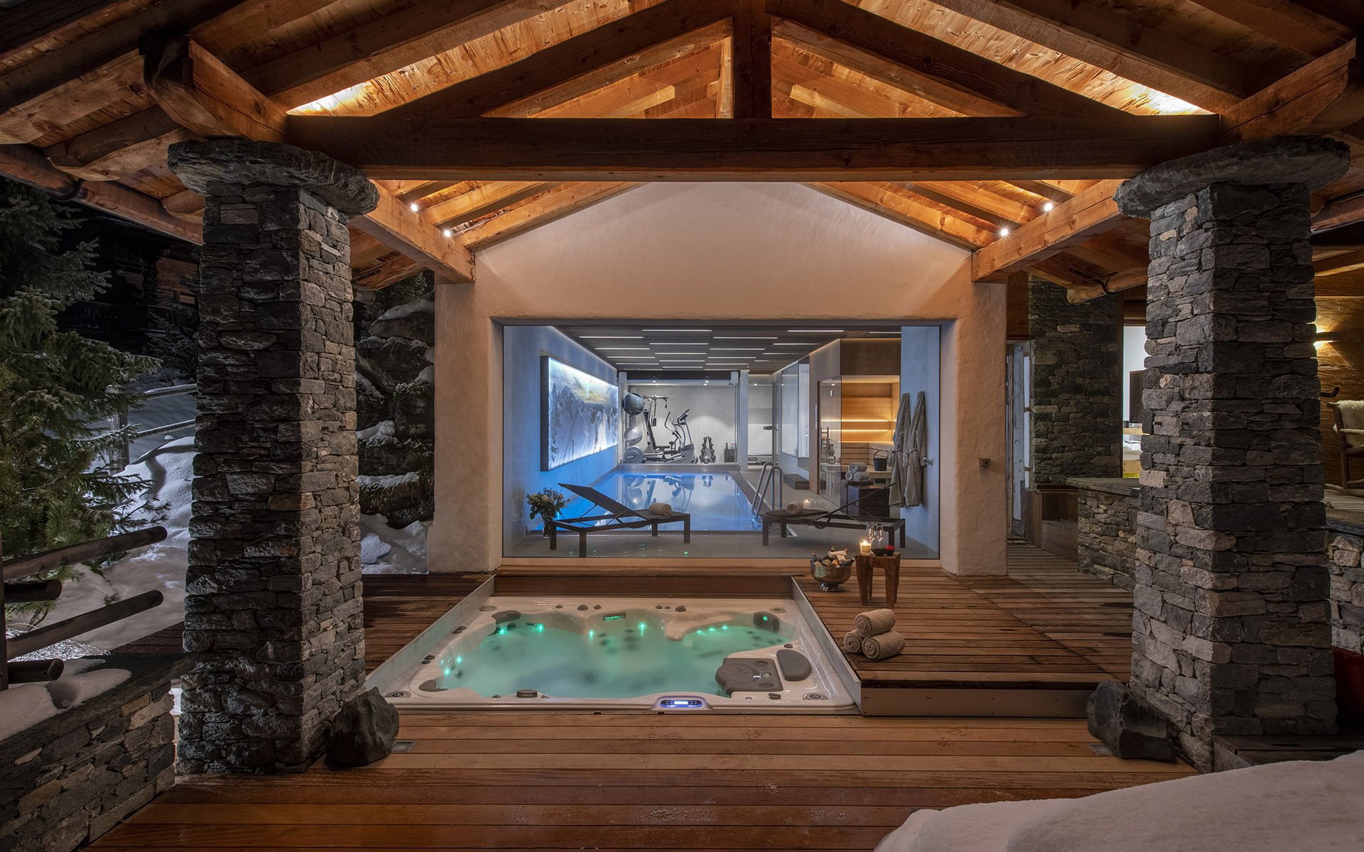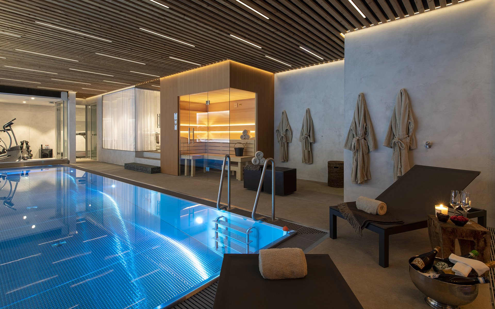 The terrace and balconies of Chalet Belle Claire showcase some of the property's impressive wellness features. These include an authentic Canadian cedar wood hot tub with ambient mood lighting, alongside a contemporary sunken Jacuzzi, perfect for soothing weary skiing muscles. The interior houses an extraordinary spa zone. The 10-metre indoor swimming pool features massage jets, a counter current system, and an innovative purification system that eliminates harsh chemicals. The facility also includes a BIO sauna, a well-appointed gym overlooking the pool, and a dedicated massage room for specialised treatments.