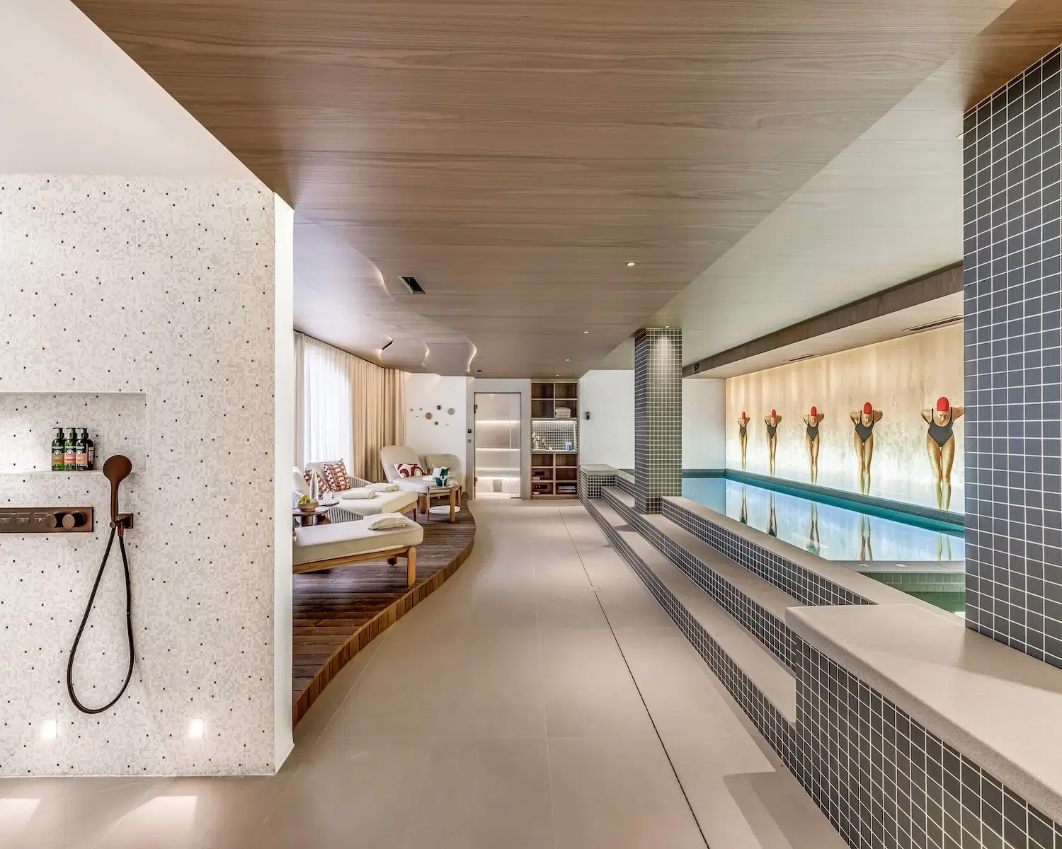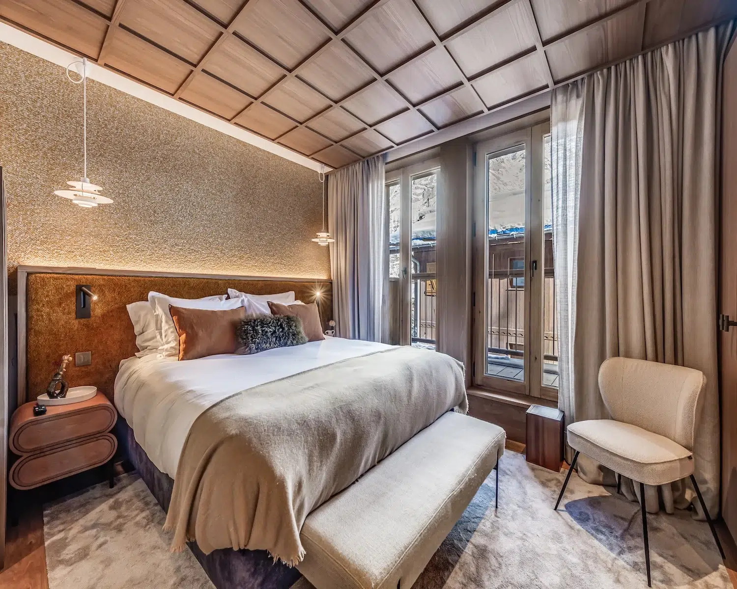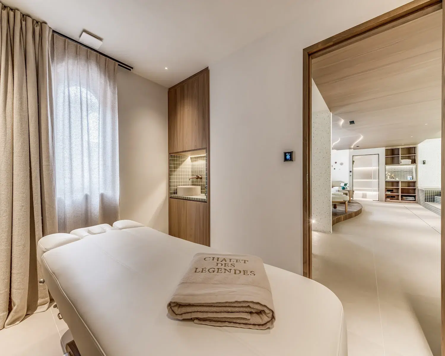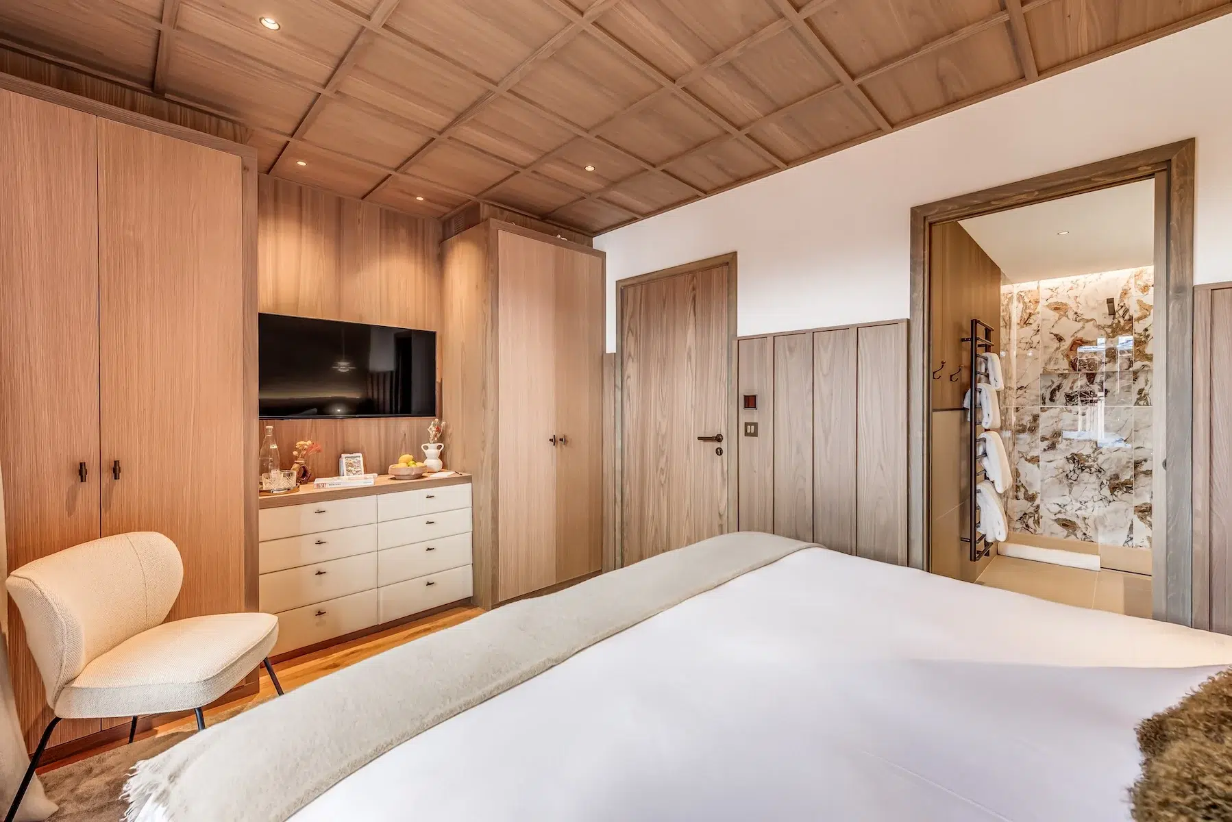 The wellness area, also situated on the ground floor, encompasses an indoor pool, Jacuzzi, steam room, and treatment space—perfect for post-slope recuperation. The first floor houses three double bedrooms and one bunk room, each boasting private en-suite shower facilities. The principal bedroom suite, positioned on the uppermost level, features a private terrace and dedicated bathroom.
