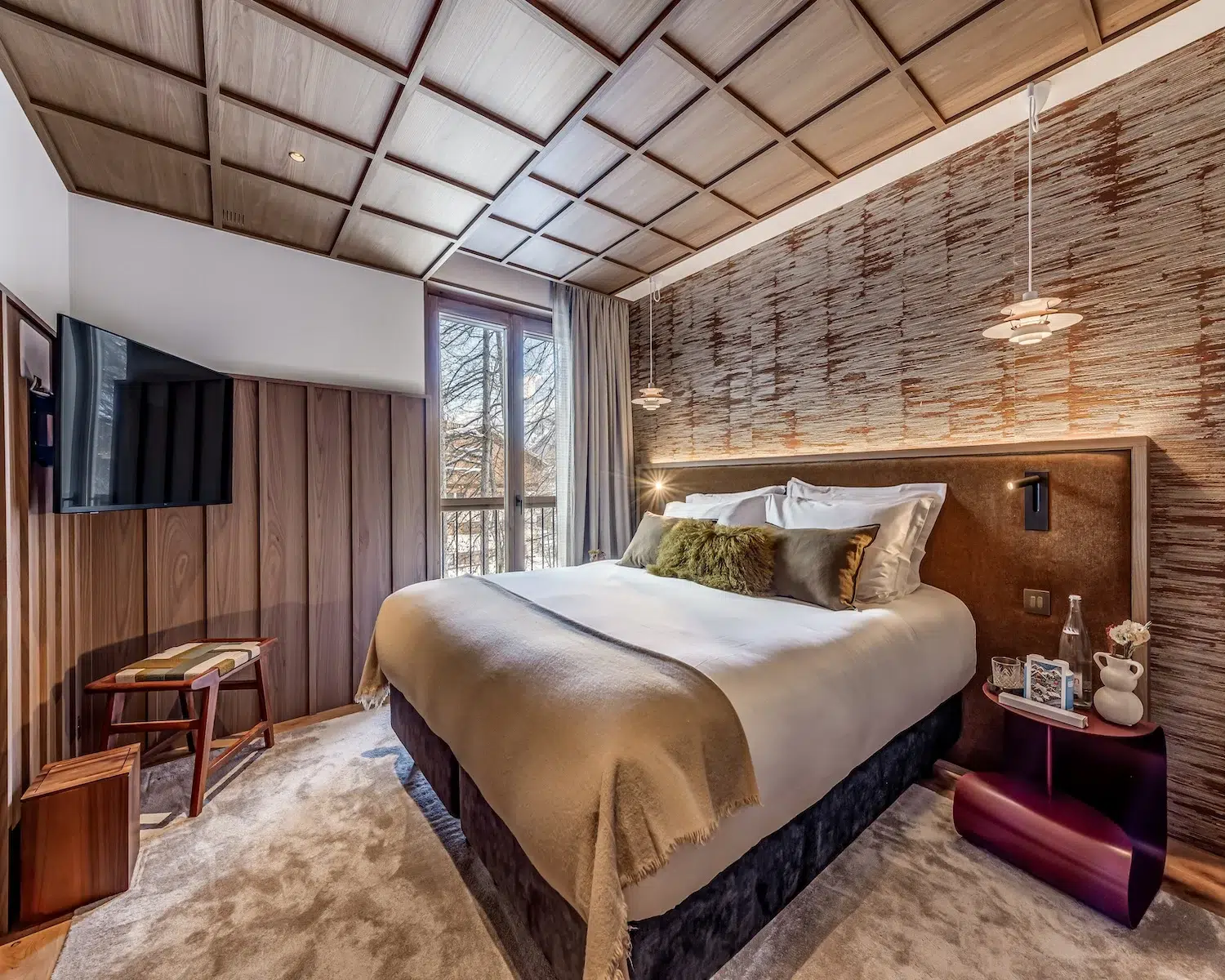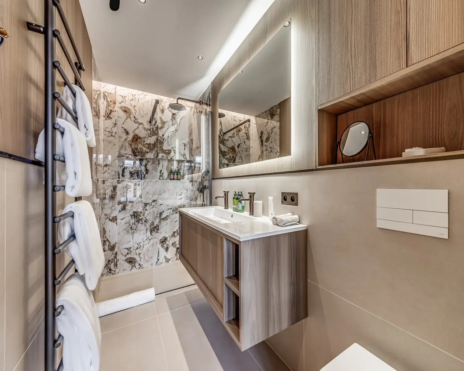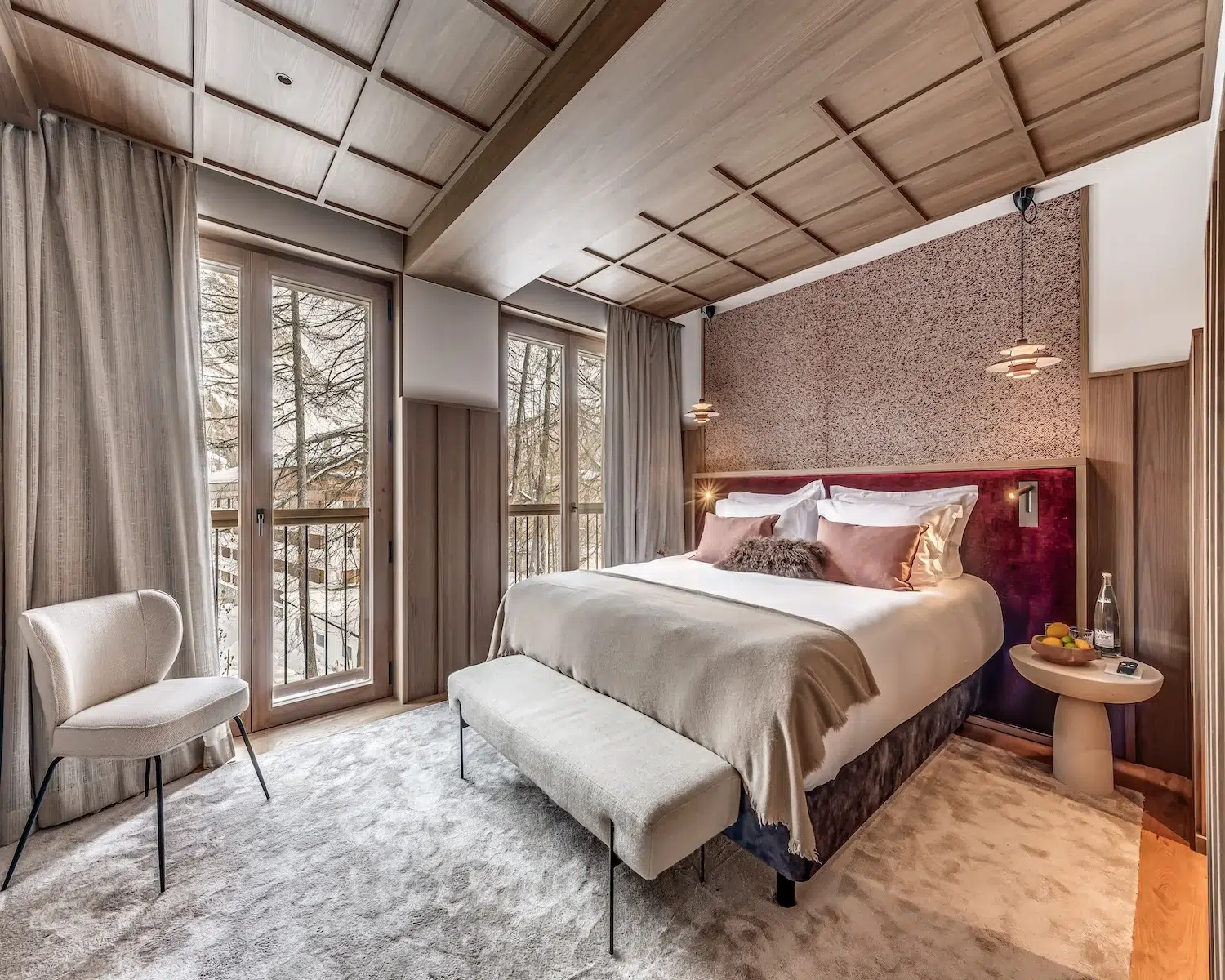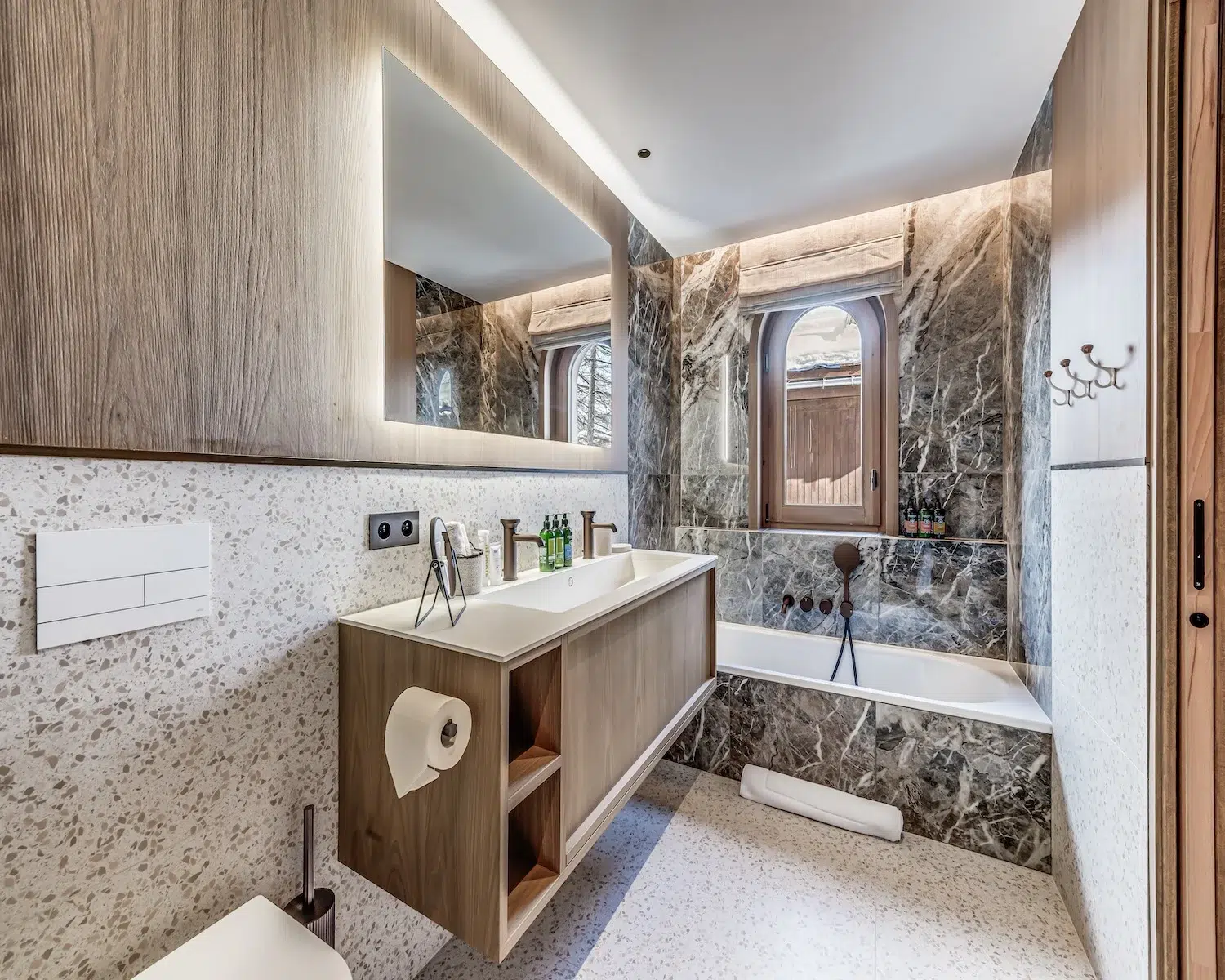 The wellness area, also situated on the ground floor, encompasses an indoor pool, Jacuzzi, steam room, and treatment space—perfect for post-slope recuperation. The first floor houses three double bedrooms and one bunk room, each boasting private en-suite shower facilities. The principal bedroom suite, positioned on the uppermost level, features a private terrace and dedicated bathroom.