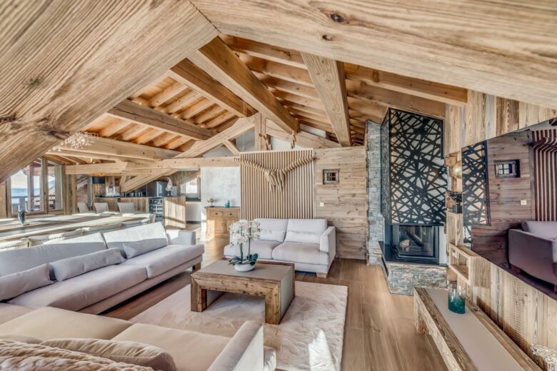 Chalet Ganga's primary living room is on the chalet's upper floor. A huge open-plan design beneath a cathedral ceiling structure with exposed wood creates a typical chalet atmosphere. At one end of the room, there is a feature fireplace as well as a pleasant nook of sofa seats with a view of the mountains. The wooden slats dividing the lounge from the entry to the floor are ingeniously created, with a bulging ibex on one side and an eagle on the other, showcasing the extraordinary attention-to-detail that has gone into painstakingly building this chalet. Plush lounge couches, sparkling chandeliers, and a custom square dining table for 16 are just a few of the luxury items that fill the room. The kitchen is modern and big, with enough of equipment to prepare wonderful evening meals. The floor is adorned with tall picture windows that flood the area with natural light, provide stunning round views of the mountains that encircle Tignes, and provide access to various balconies.