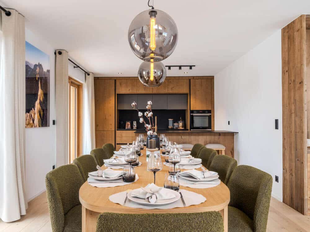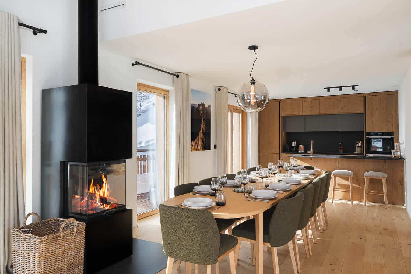 The main living area offers an open plan kitchen, a dining area for 12 guests and a lounge area with a wood stove. There is a large balcony with mountains views.