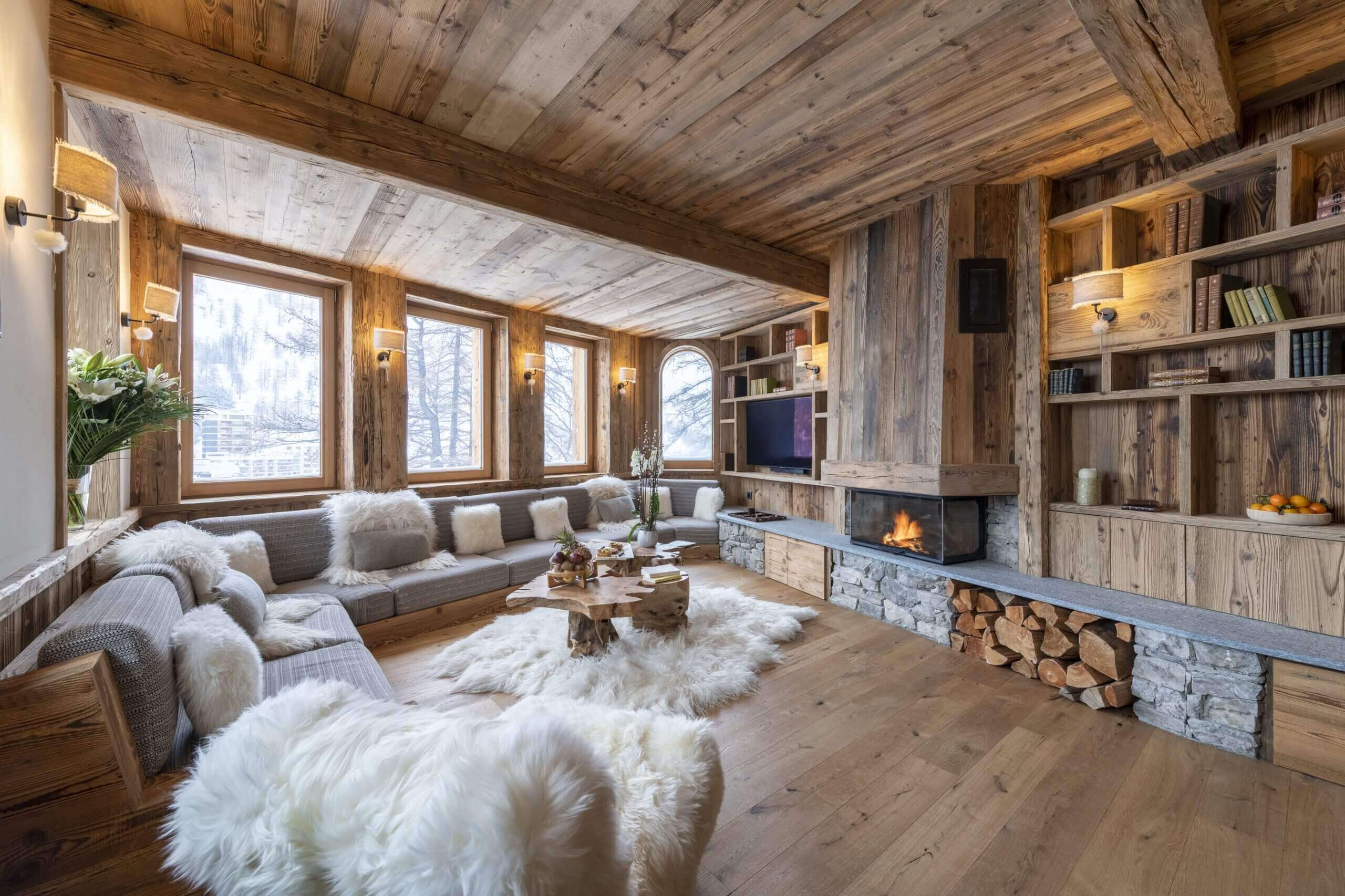 Taking the steps down will lead you to the chalet's spectacular open plan kitchen, living, and dining space, which has been created to offer a friendly, warm, and peaceful entertainment room. The views of the snowy mountains beyond are framed by a bank of wide windows at the far end of the room. The room's center feature is the big open fireplace, which is flanked by open bookcases on each side. The custom sheepskin corner sofa adds to the room's comfortable and serene vibe. The elegant circular marble dining table easily accommodates eight guests, and the open plan architecture of the rooms allows for fireplace eating. The kitchen is hidden behind the stairs, giving it a private atmosphere while keeping whoever is cooking in the loop. This level also houses the second bedroom, the family suite, which has a twin/double bed and children's bunk beds as well as an en-suite shower room.
