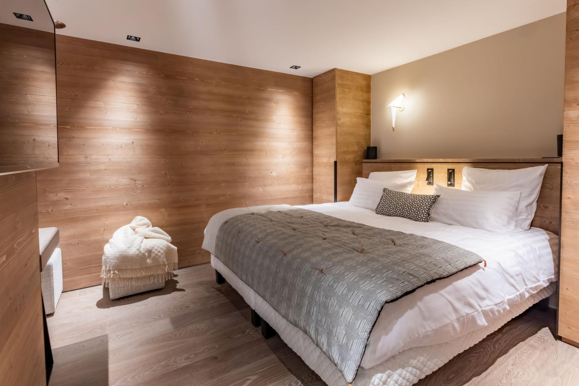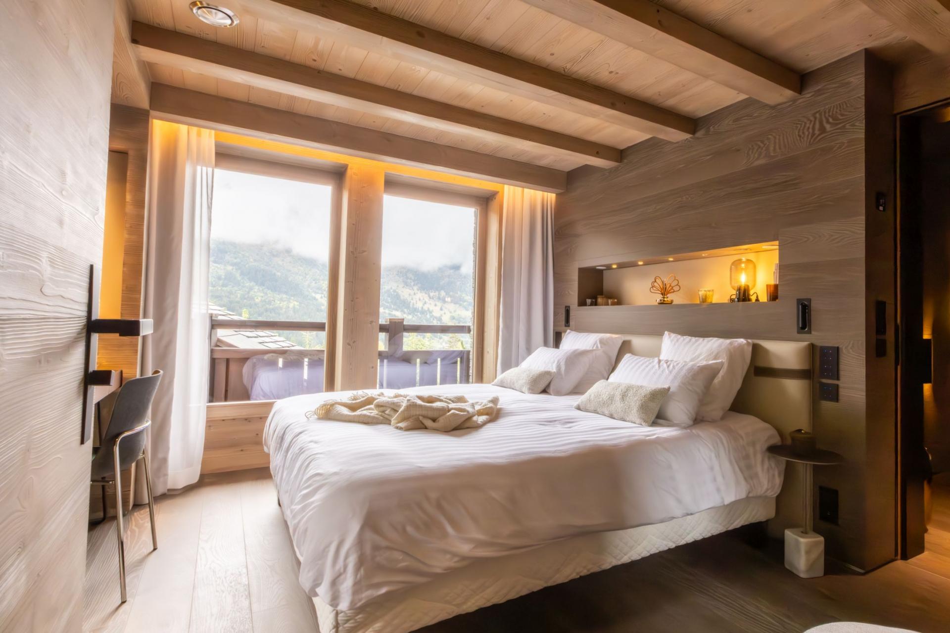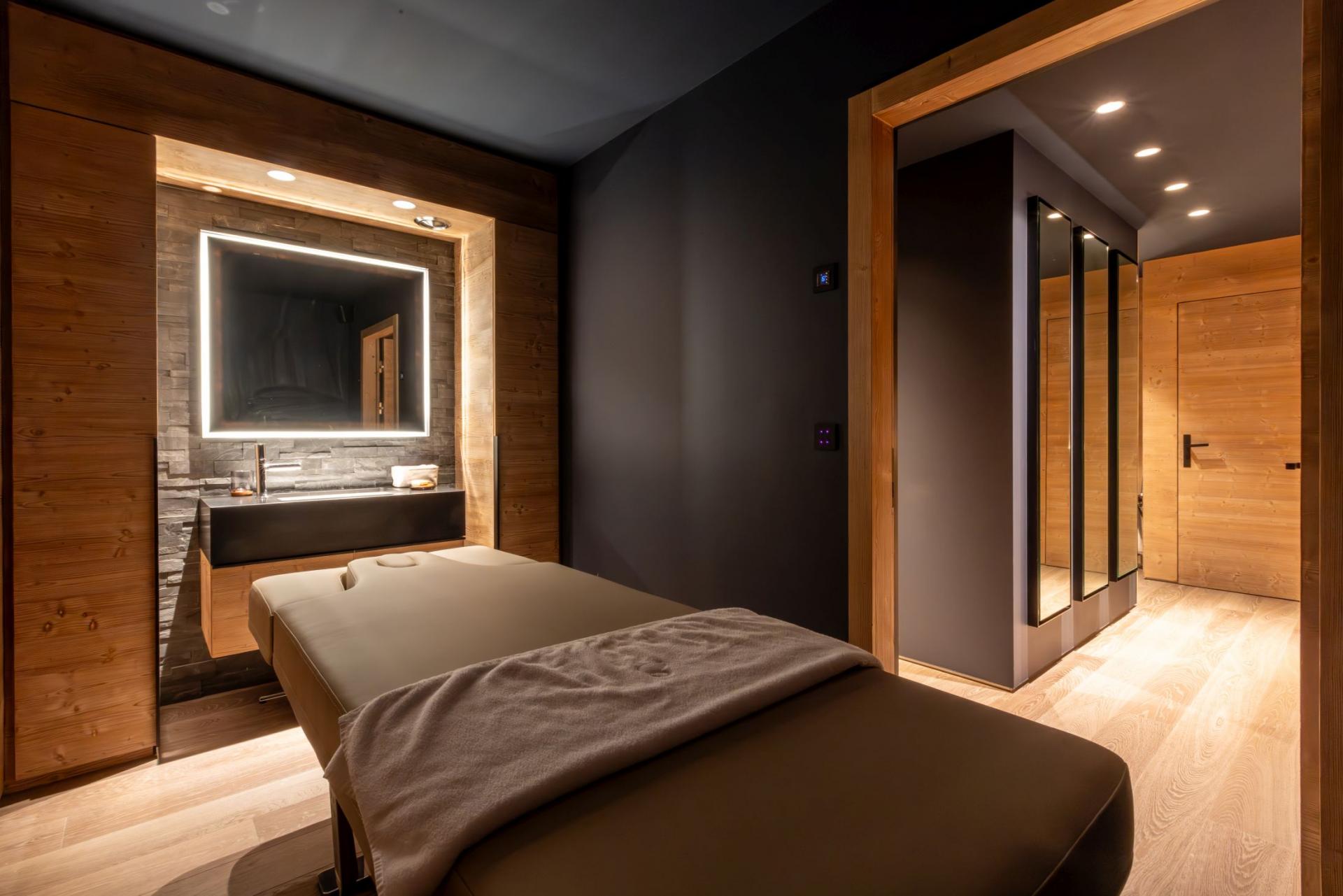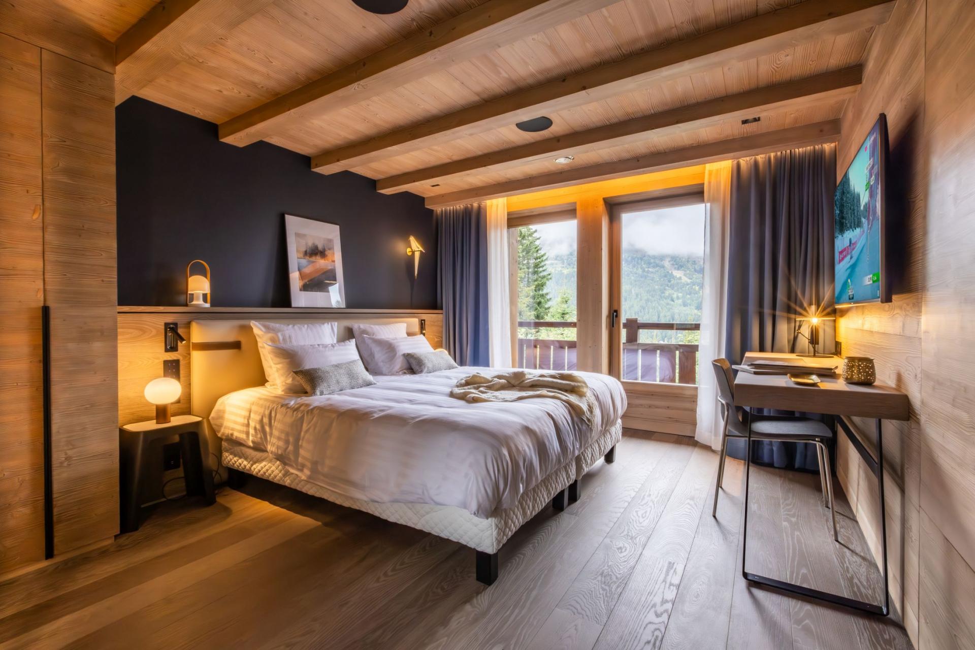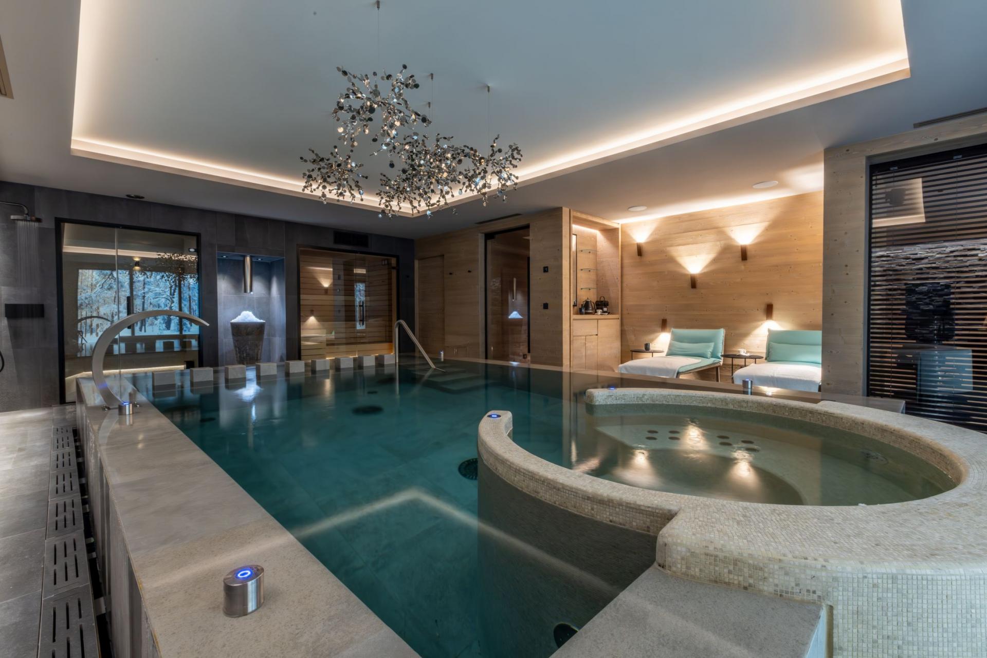 Chalet Kirana is an exquisite ski chalet nestled in Méribel, offering accommodation for up to 14 guests. This centrally-located mountain retreat sits within easy reach of the slopes and provides the perfect base to experience all the delights of the resort. With its premium wellness facilities and refined living spaces, Chalet Kirana presents an ideal choice for families and groups seeking a distinguished ski chalet in the Three Valleys. The main living area crowns the top floor of Chalet Kirana, presenting an enchanting space that harmoniously marries traditional charm with contemporary refinement. The impressive vaulted ceilings with exposed wooden beams create an atmosphere of spacious magnificence. A generous lounge area extends along one side, illuminated by abundant natural light streaming through the vast windows. The elegant, modern fireplace serves as a central feature, its dancing flames providing a cosy warmth throughout. As you move through the fluid open-plan layout, you'll discover the sophisticated, fully-equipped kitchen, enhanced by an elegant breakfast bar. The magnificent banquet dining table stands adjacent to the kitchen, creating the perfect setting for both intimate family meals and vibrant social gatherings filled with joy and merriment. After savouring the evening's culinary delights, step onto the private balcony with an after-dinner drink to breathe in the invigorating mountain air. The pinnacle of this remarkable property lies in its opulent spa and leisure facilities, crafted to deliver ultimate relaxation and restoration. The indoor swimming pool, enhanced by a captivating faux mountain backdrop, establishes an ambiance of pure serenity. A dedicated seating area with therapeutic massage jets awaits at one end, ideal for soothing weary muscles. The adjacent sauna, Hammam, and dedicated relaxation zone provide peaceful havens for unwinding. For fitness enthusiasts, a well-appointed exercise area featuring a treadmill and exercise bike stands ready. As evening approaches, the plush cinema room beckons, its comfortable sofas inviting you to unwind with a film in the company of family and friends. Chalet Kirana houses seven beautifully appointed bedrooms across two levels, comfortably hosting up to 14 guests. Each room exemplifies refined alpine minimalism, combining modern sophistication with natural elements to create serene and welcoming spaces. The luxurious beds ensure restorative sleep, while private en-suite facilities, featuring either a shower or bath, complement each bedroom. With all but one bedroom offering outdoor access via a balcony or terrace, guests can enjoy moments of quiet contemplation while admiring the stunning alpine panorama. The thoughtful blend of comfort, elegance, and practicality guarantees a truly memorable stay. For added convenience, the property is equipped with indoor parking facilities, an internal lift serving all floors, laundry amenities, and a dedicated ski room complete with boot warmers. The chalet is available for exclusive use by up to 14 guests and includes the services of a dedicated chef who prepares daily breakfast and evening meals throughout your week-long stay, alongside an in-resort driver service. Food and beverage costs are charged separately. Additional bespoke services can be arranged upon request.BEDROOMS LAYOUT