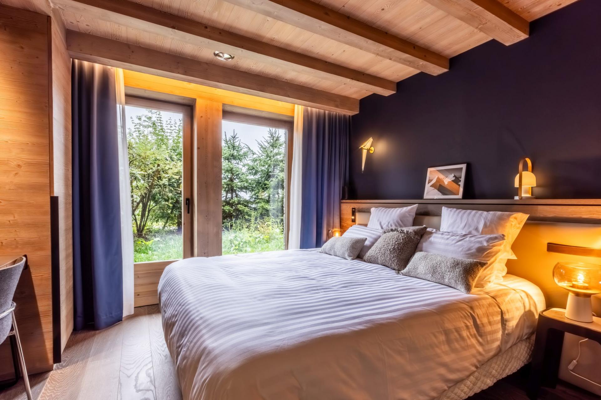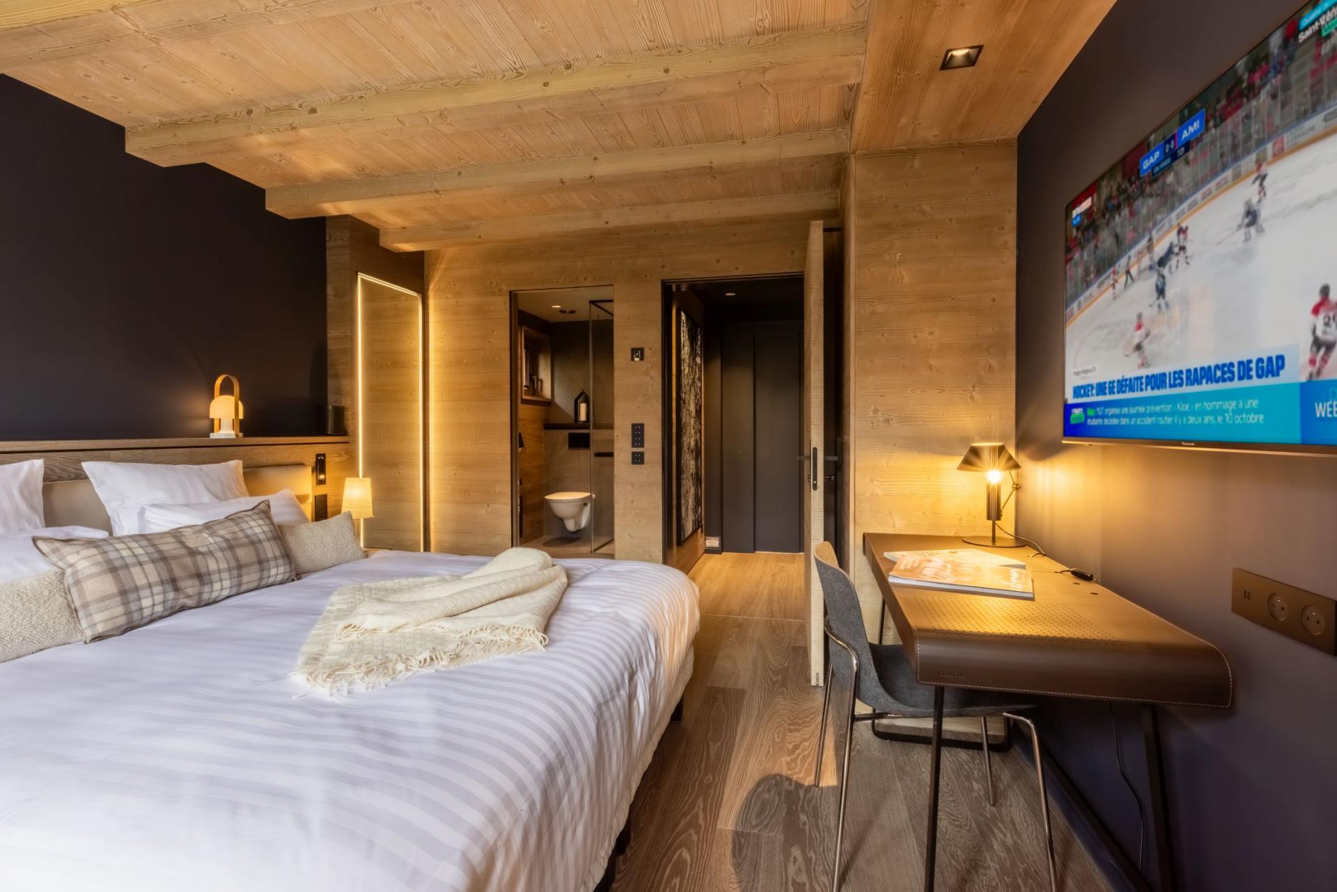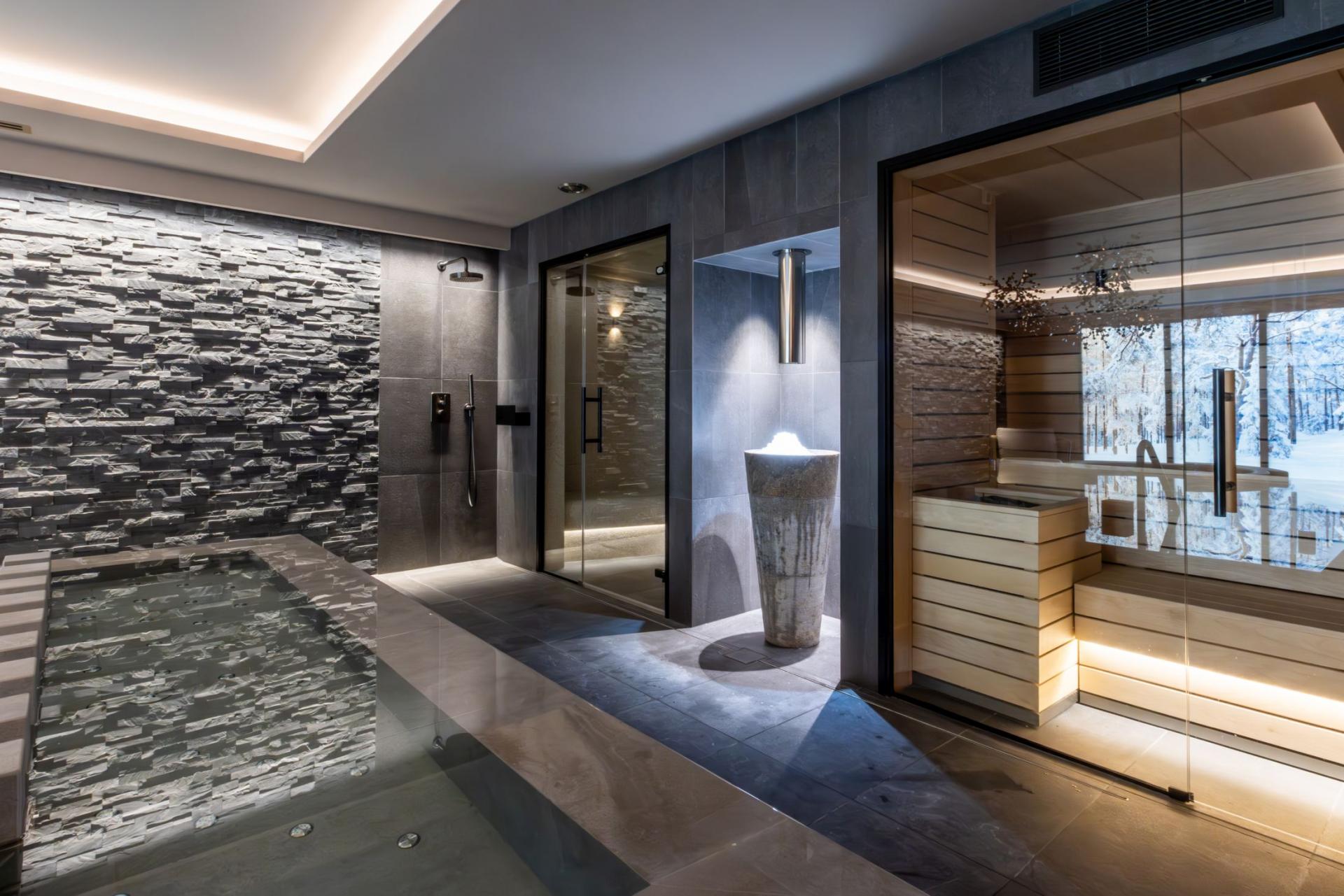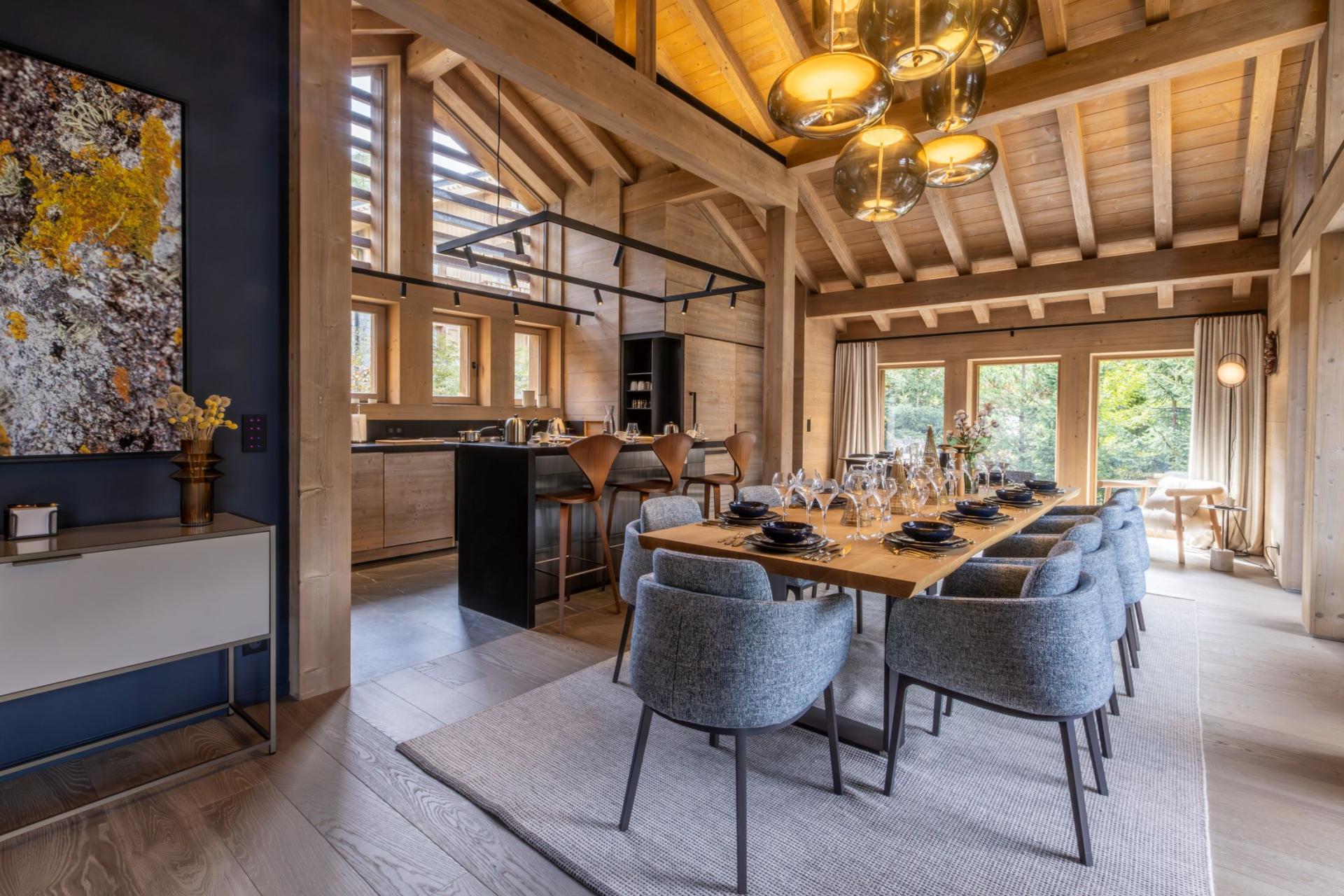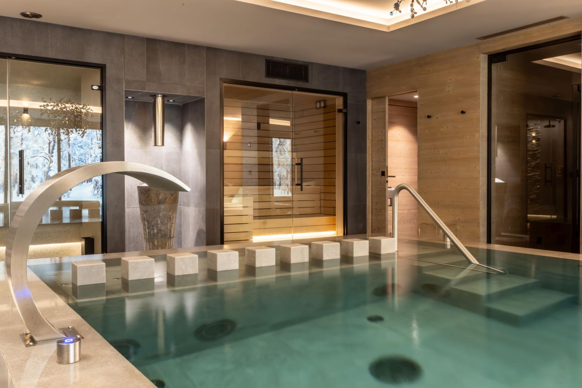 Chalet Kirana is an exquisite ski chalet nestled in Méribel, offering accommodation for up to 14 guests. This centrally-located mountain retreat sits within easy reach of the slopes and provides the perfect base to experience all the delights of the resort. With its premium wellness facilities and refined living spaces, Chalet Kirana presents an ideal choice for families and groups seeking a distinguished ski chalet in the Three Valleys. The main living area crowns the top floor of Chalet Kirana, presenting an enchanting space that harmoniously marries traditional charm with contemporary refinement. The impressive vaulted ceilings with exposed wooden beams create an atmosphere of spacious magnificence. A generous lounge area extends along one side, illuminated by abundant natural light streaming through the vast windows. The elegant, modern fireplace serves as a central feature, its dancing flames providing a cosy warmth throughout. As you move through the fluid open-plan layout, you'll discover the sophisticated, fully-equipped kitchen, enhanced by an elegant breakfast bar. The magnificent banquet dining table stands adjacent to the kitchen, creating the perfect setting for both intimate family meals and vibrant social gatherings filled with joy and merriment. After savouring the evening's culinary delights, step onto the private balcony with an after-dinner drink to breathe in the invigorating mountain air. The pinnacle of this remarkable property lies in its opulent spa and leisure facilities, crafted to deliver ultimate relaxation and restoration. The indoor swimming pool, enhanced by a captivating faux mountain backdrop, establishes an ambiance of pure serenity. A dedicated seating area with therapeutic massage jets awaits at one end, ideal for soothing weary muscles. The adjacent sauna, Hammam, and dedicated relaxation zone provide peaceful havens for unwinding. For fitness enthusiasts, a well-appointed exercise area featuring a treadmill and exercise bike stands ready. As evening approaches, the plush cinema room beckons, its comfortable sofas inviting you to unwind with a film in the company of family and friends. Chalet Kirana houses seven beautifully appointed bedrooms across two levels, comfortably hosting up to 14 guests. Each room exemplifies refined alpine minimalism, combining modern sophistication with natural elements to create serene and welcoming spaces. The luxurious beds ensure restorative sleep, while private en-suite facilities, featuring either a shower or bath, complement each bedroom. With all but one bedroom offering outdoor access via a balcony or terrace, guests can enjoy moments of quiet contemplation while admiring the stunning alpine panorama. The thoughtful blend of comfort, elegance, and practicality guarantees a truly memorable stay. For added convenience, the property is equipped with indoor parking facilities, an internal lift serving all floors, laundry amenities, and a dedicated ski room complete with boot warmers. The chalet is available for exclusive use by up to 14 guests and includes the services of a dedicated chef who prepares daily breakfast and evening meals throughout your week-long stay, alongside an in-resort driver service. Food and beverage costs are charged separately. Additional bespoke services can be arranged upon request.BEDROOMS LAYOUT
