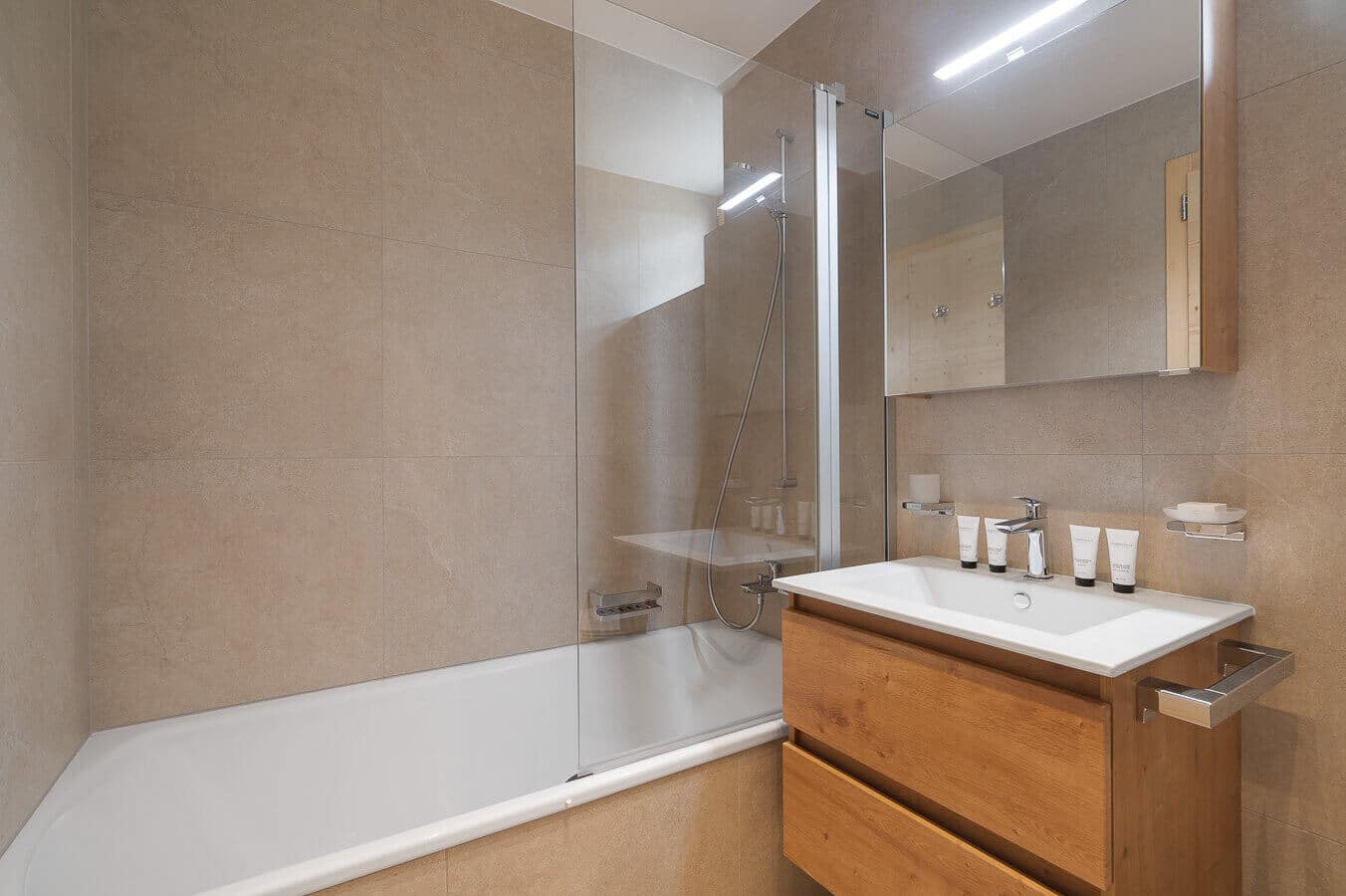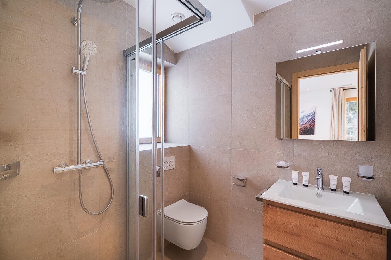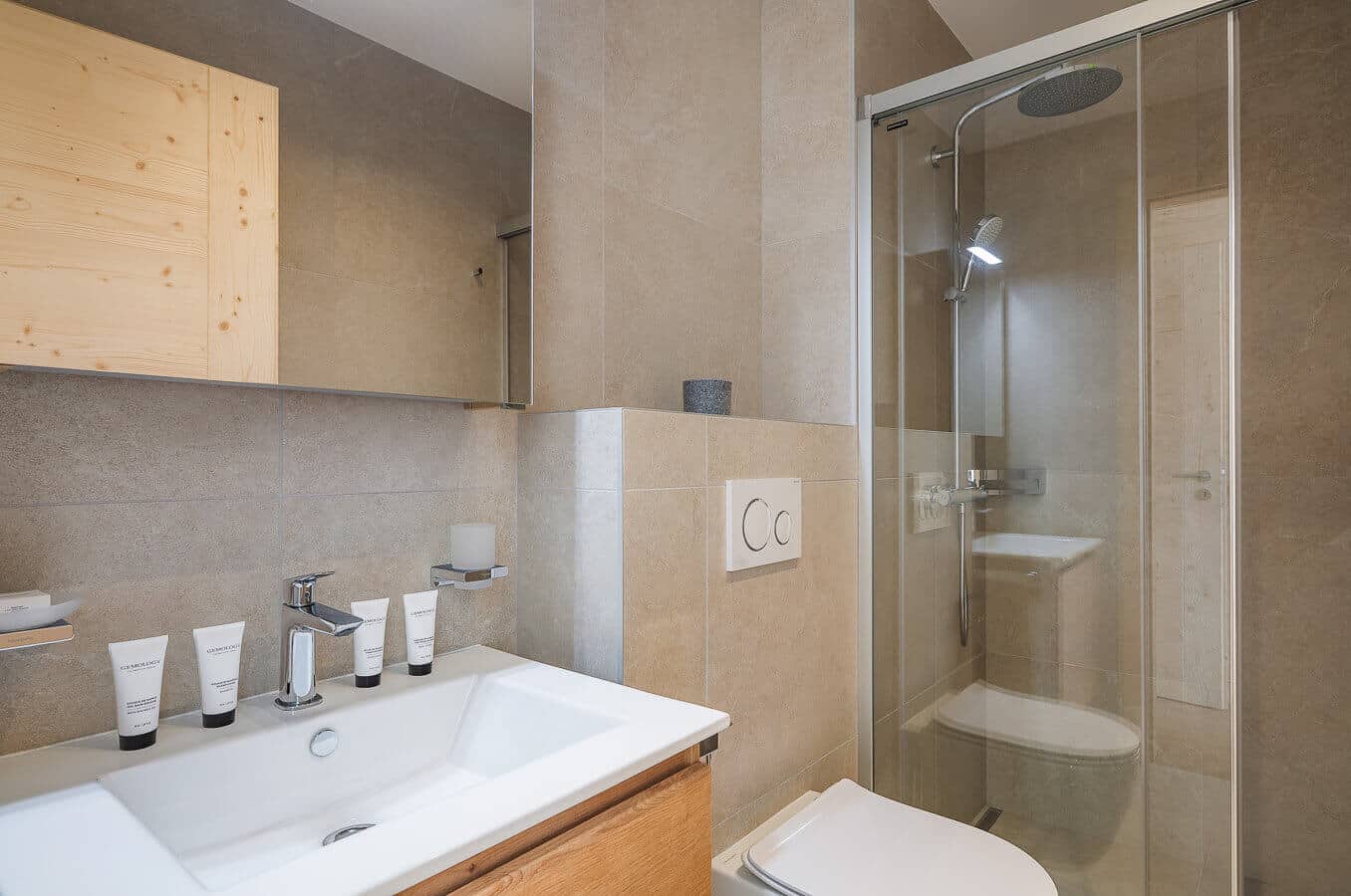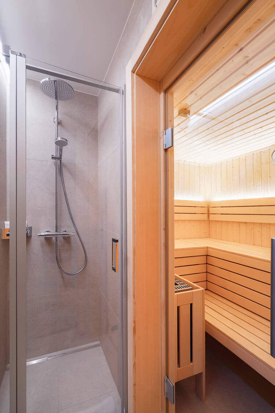 The guest of Chalet L have access to the 700 m² Guernerés Spa is a sanctuary of relaxation, offering shared access to an indoor-outdoor heated pool, sauna, hammam, sensory showers, and a state-of-the-art fitness area overlooking the Alps.