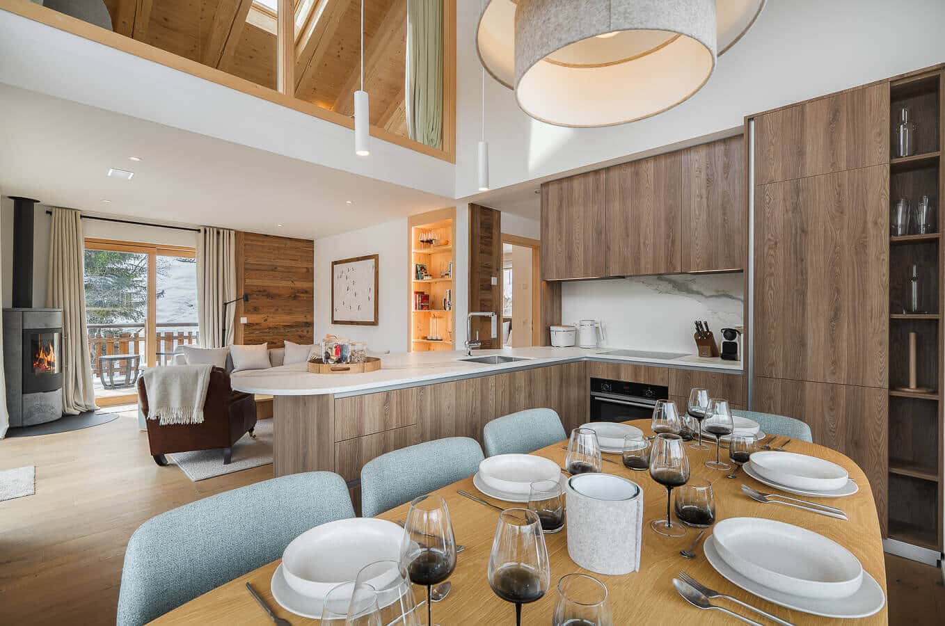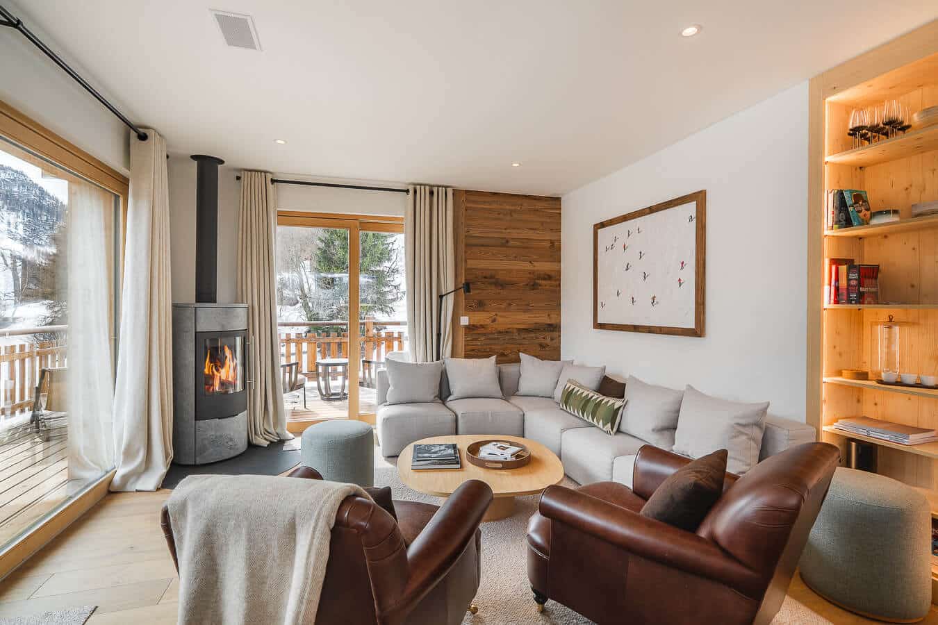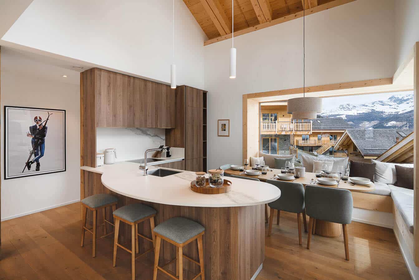 Each residence blends traditional alpine architecture — wood, stone, and large panoramic windows — with contemporary design and top-of-the-line amenities.