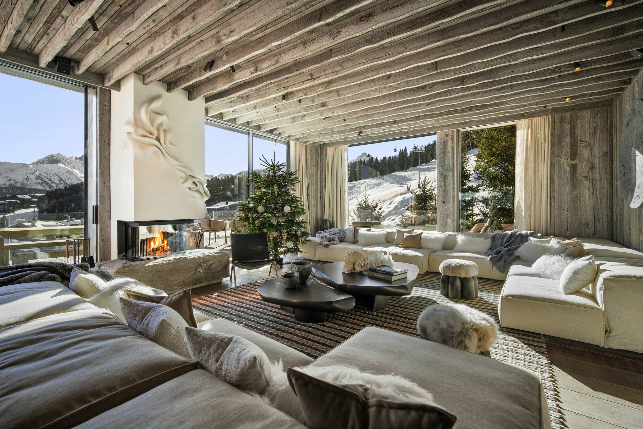 The principal living space, positioned on the third level, makes an immediate impact. Floor-to-ceiling windows capture sweeping mountain scenery, whilst a plush wraparound sofa, refined dining space and open-plan kitchen create an ideal setting for relaxation or social gatherings.