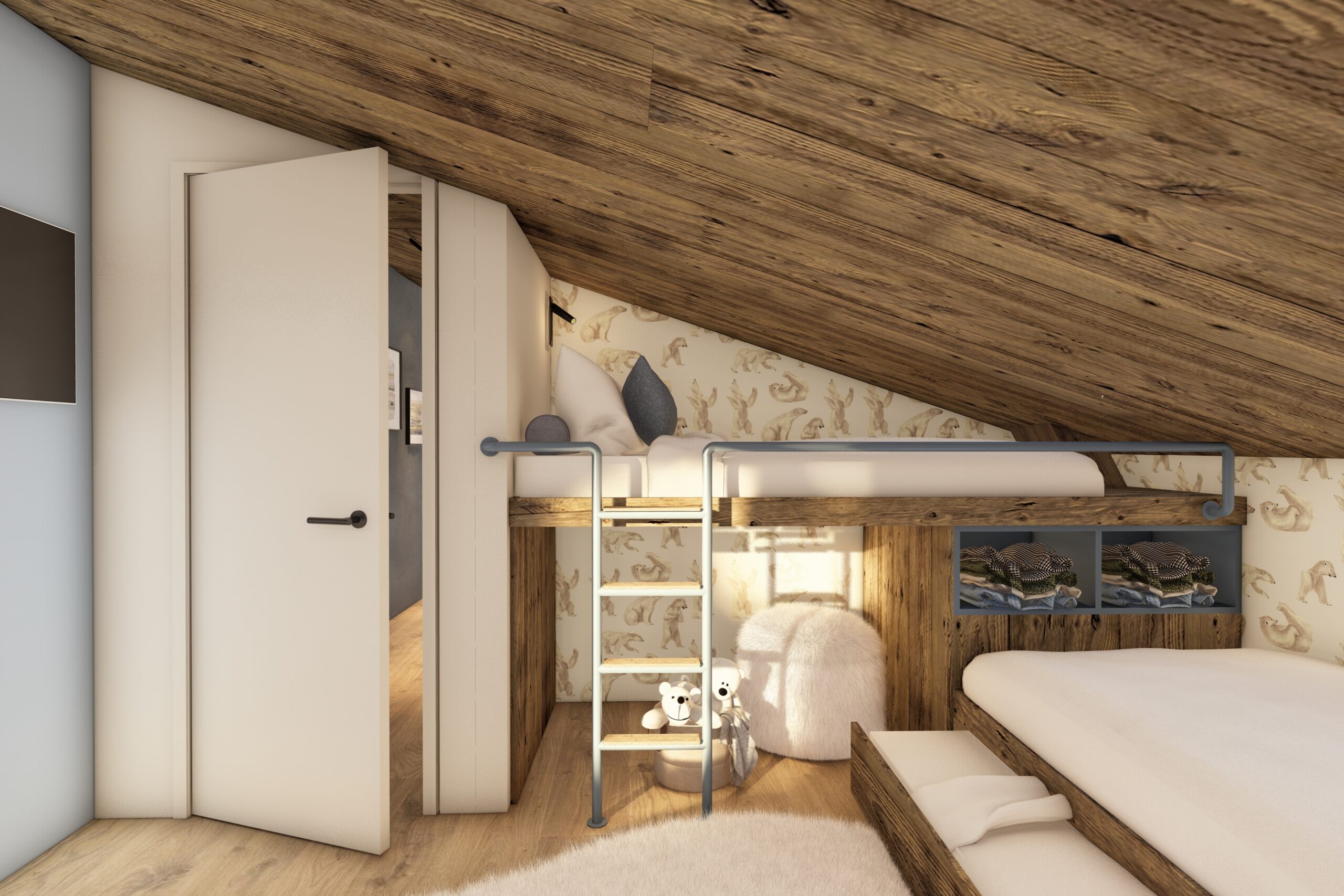 The chalet spans 220 m² and accommodates up to 8 adults + 5 children, featuring 3 en-suite bedrooms and a dedicated family room with multiple beds with its shower room.