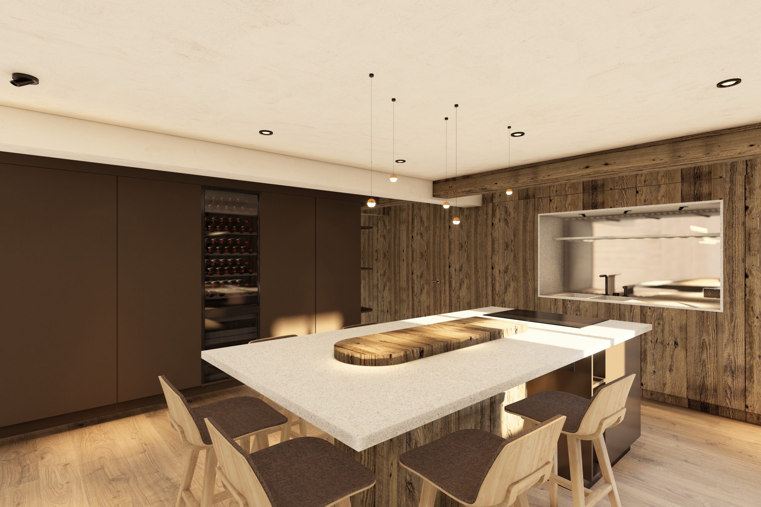 Décor mixes warm alpine wood and modern furnishings in soft tones, lending a welcoming yet sophisticated ambiance for family or friends.