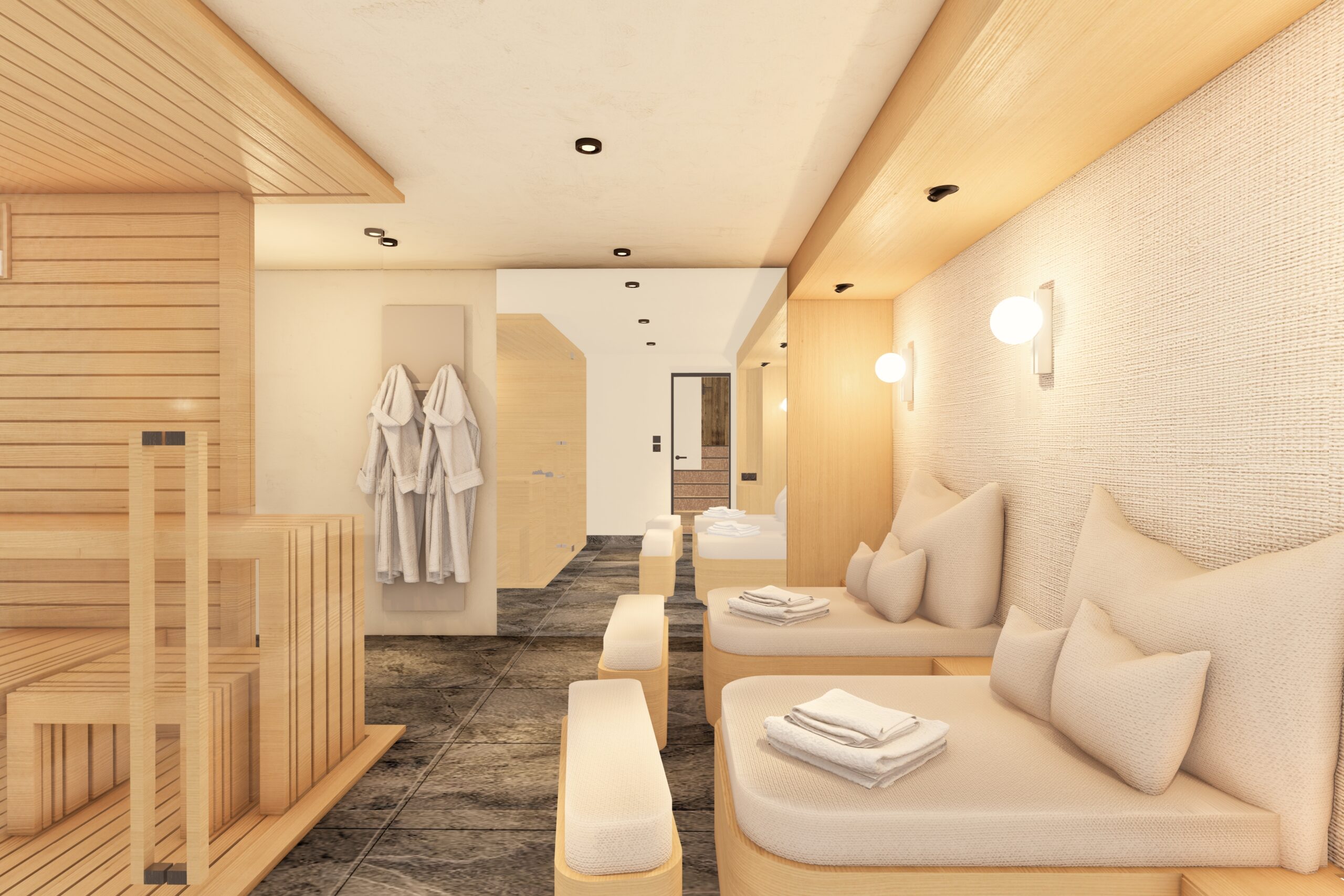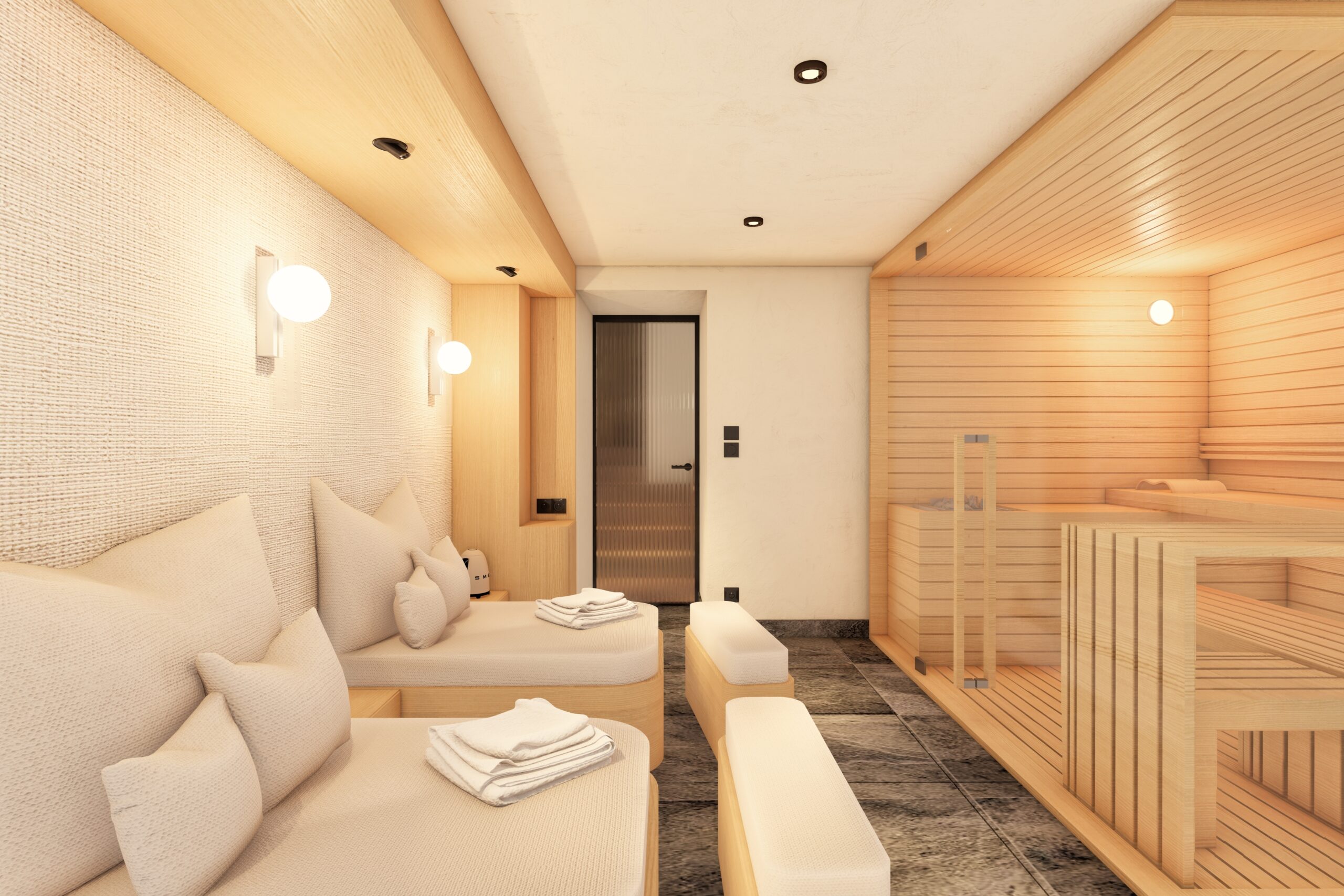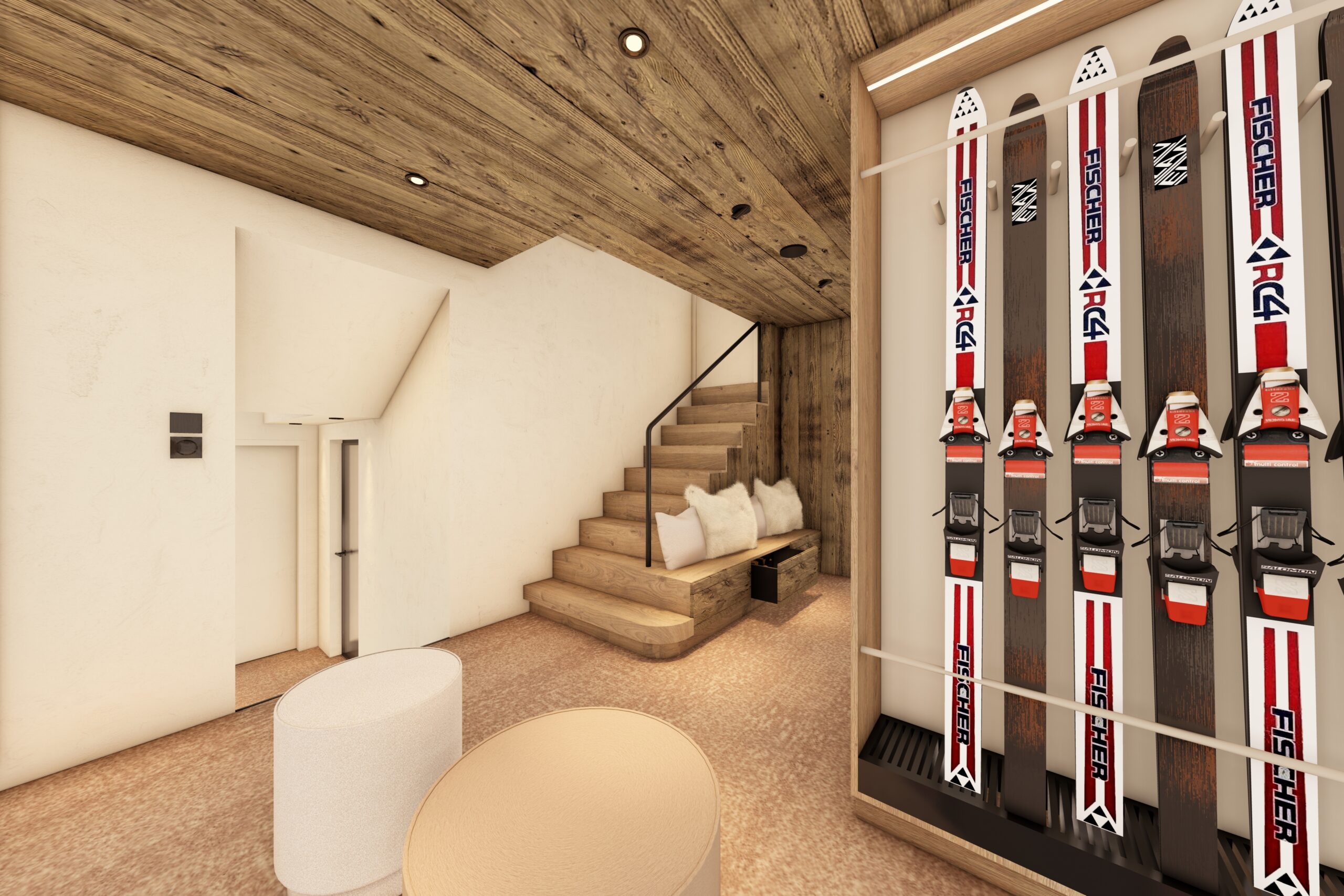 The lower ground floor is dedicated to the wellness area with sauna and shower, ski-room with boot warmers and locker space.