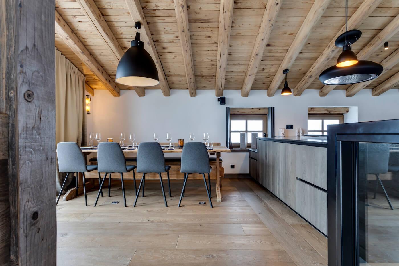Floor-to-ceiling windows flood the chalet with natural alpine light, illuminating the elegant dining space, a cosy relaxation lounge and a fully equipped modern kitchen