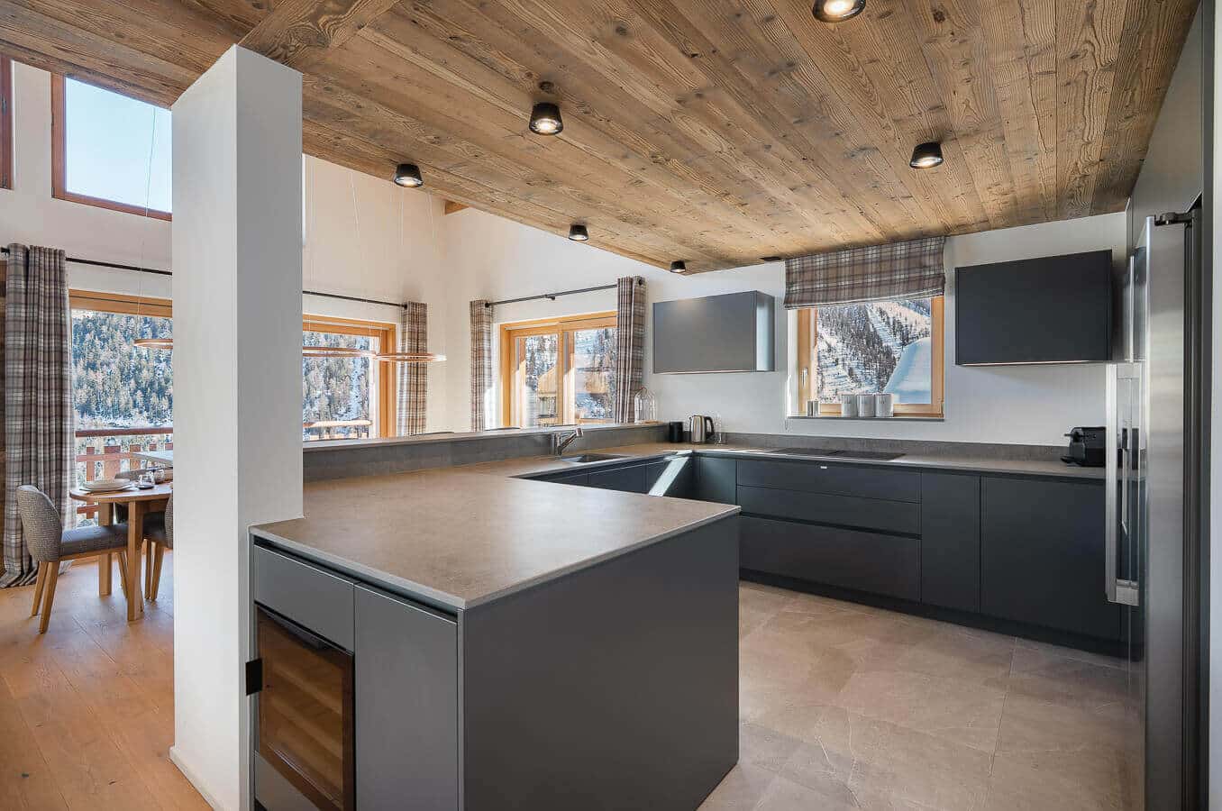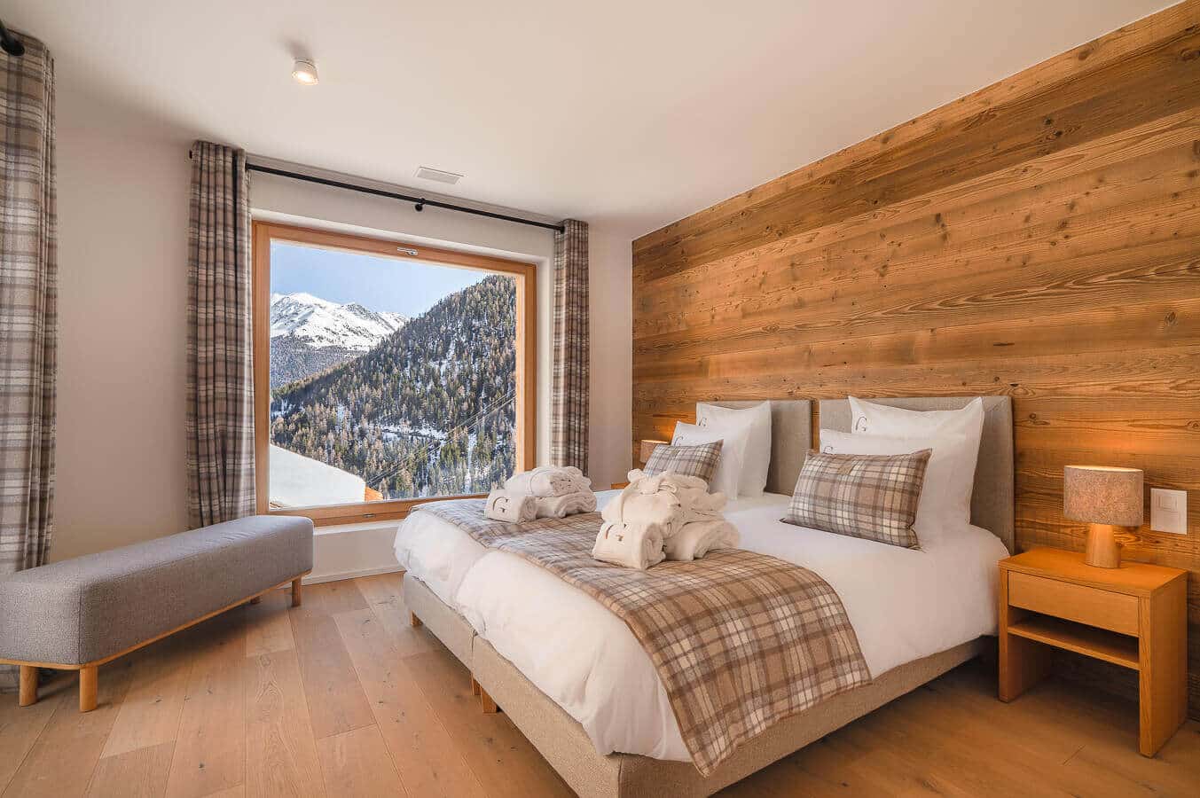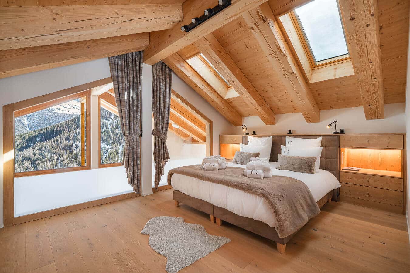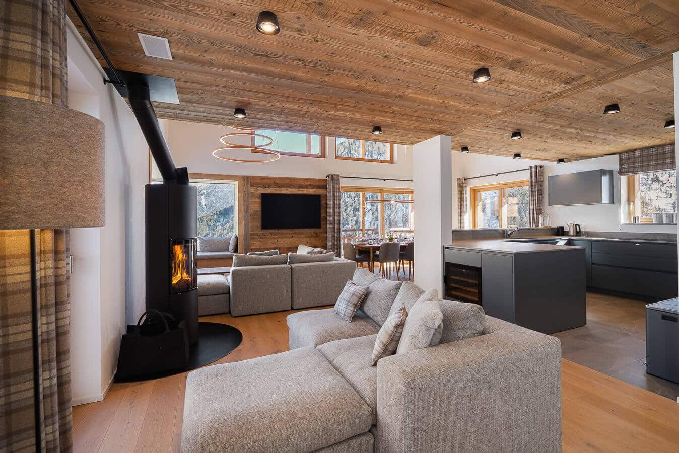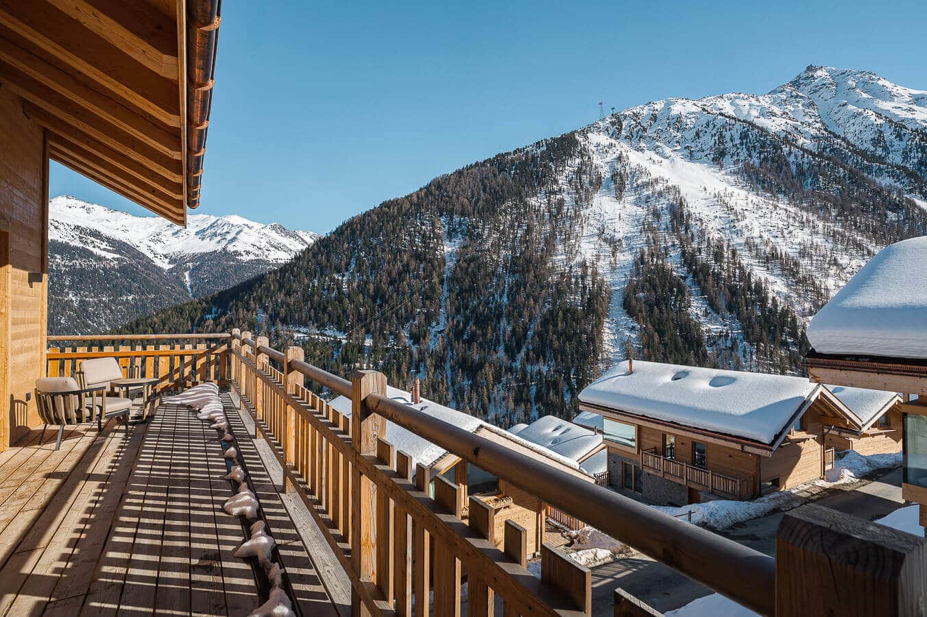 Each residence blends traditional alpine architecture — wood, stone, and large panoramic windows — with contemporary design and top-of-the-line amenities.