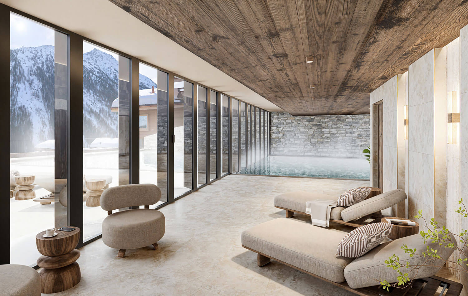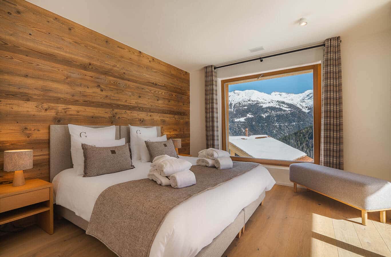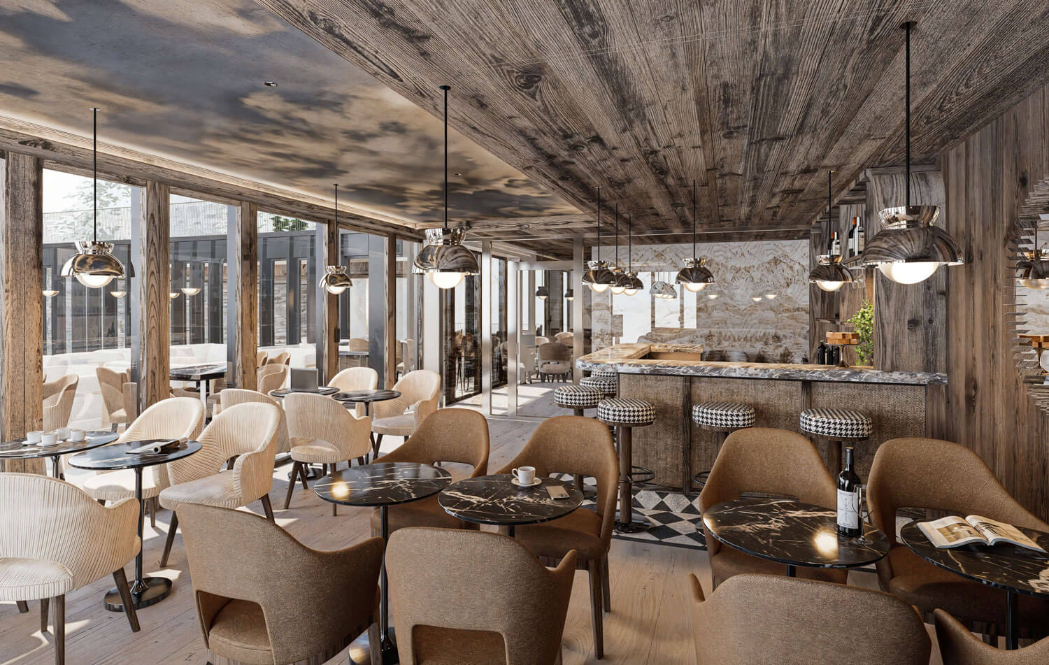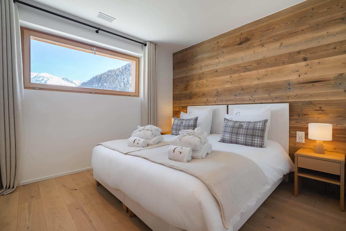 Each residence blends traditional alpine architecture — wood, stone, and large panoramic windows — with contemporary design and top-of-the-line amenities.
