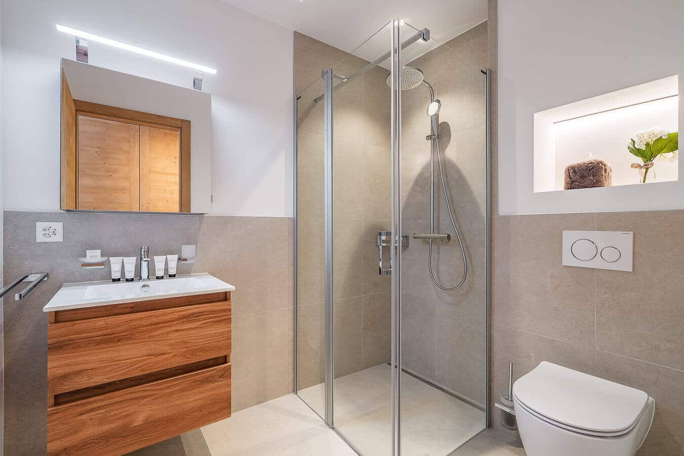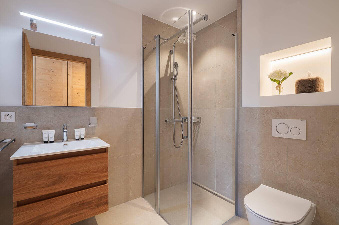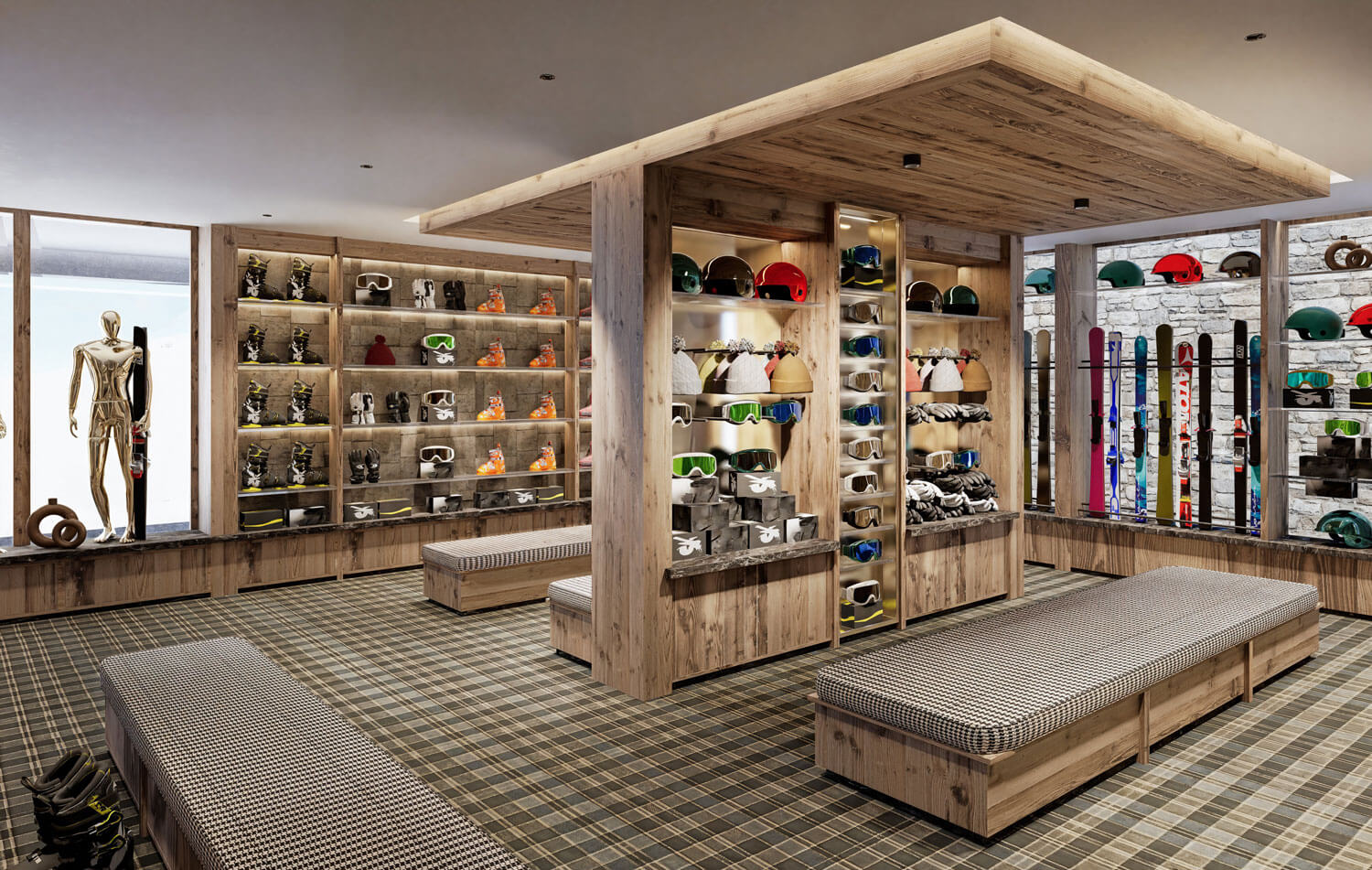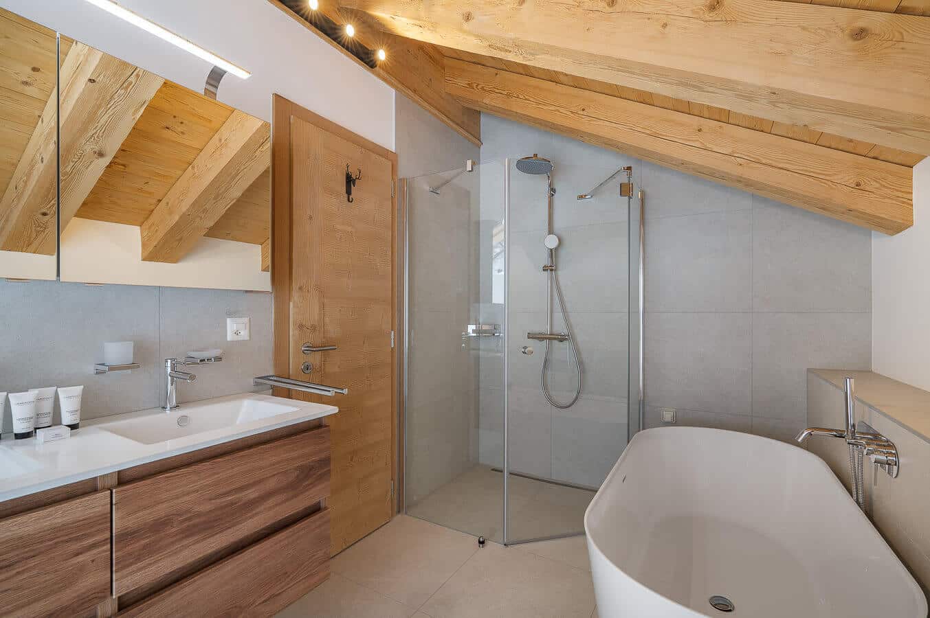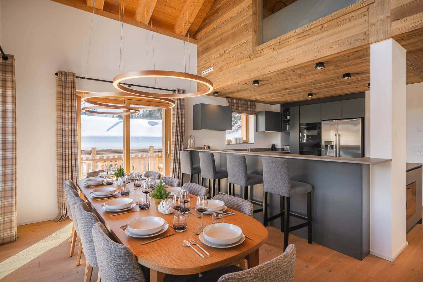 Each residence blends traditional alpine architecture — wood, stone, and large panoramic windows — with contemporary design and top-of-the-line amenities.