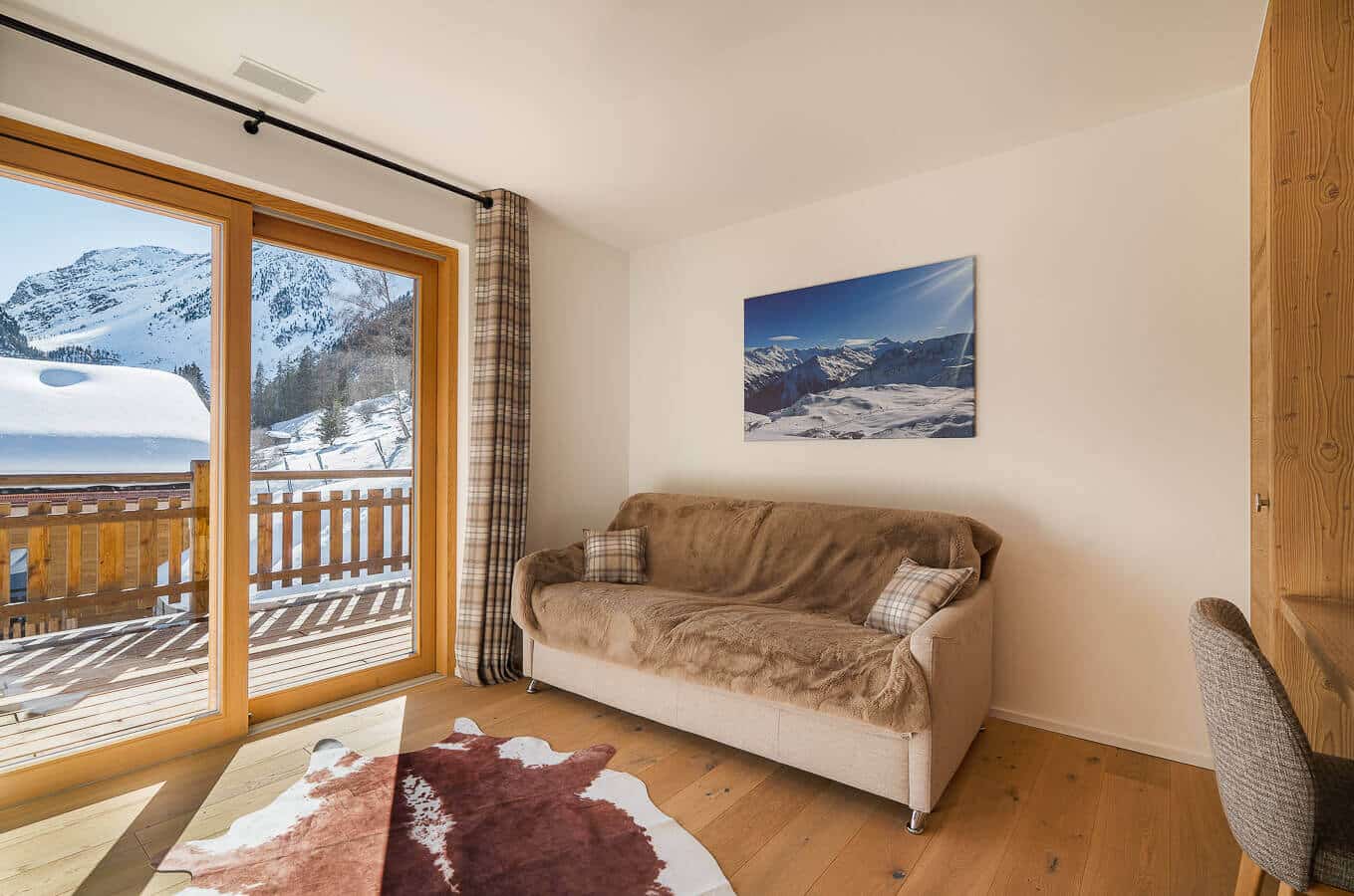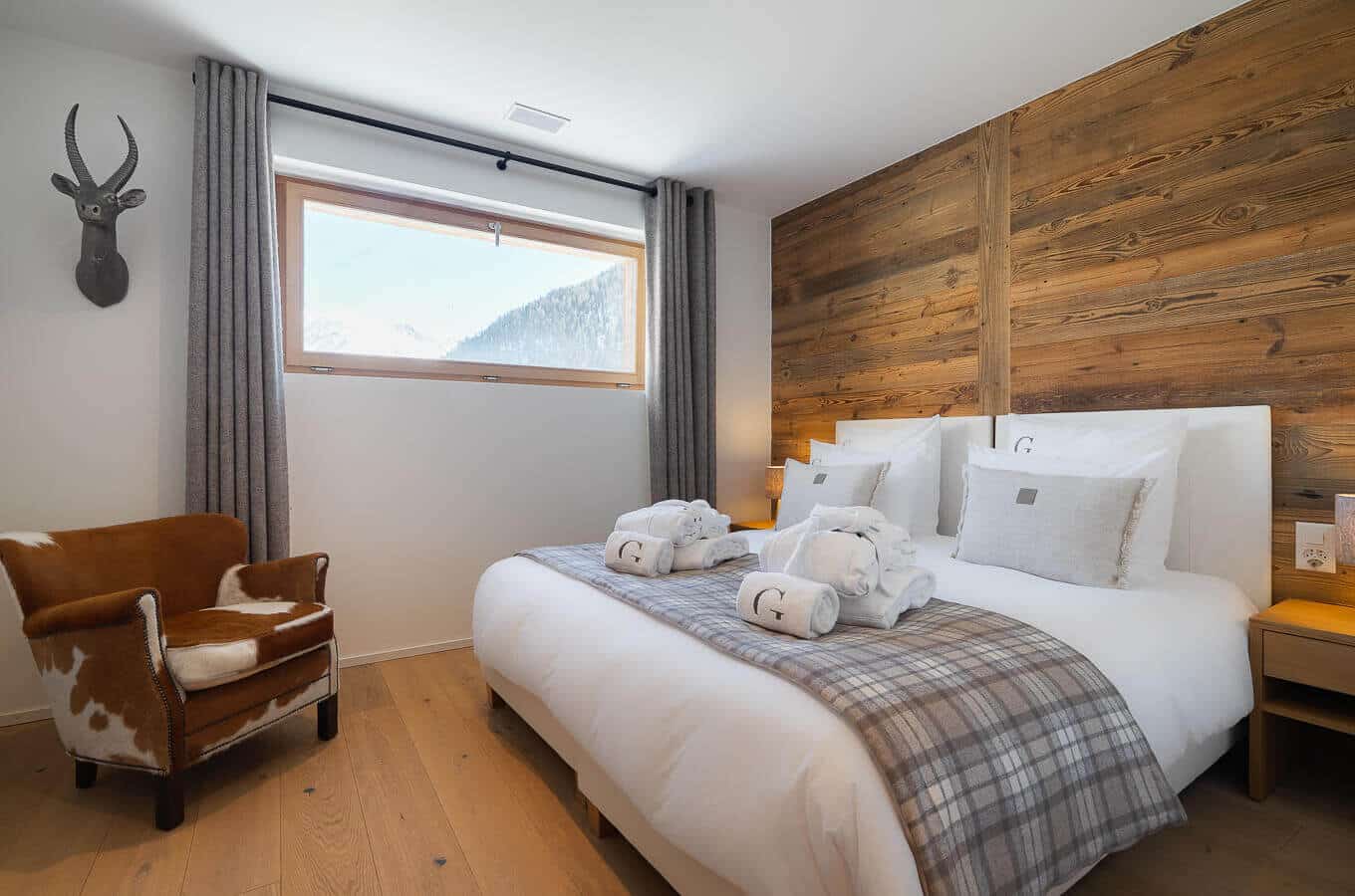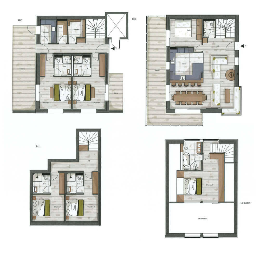 Chalet P is an individual chalet of 215 m2 over four floors. The chalet sleeps up to 10 guests in 5 double bedrooms. There is a TV room with a convertible sofa bed.