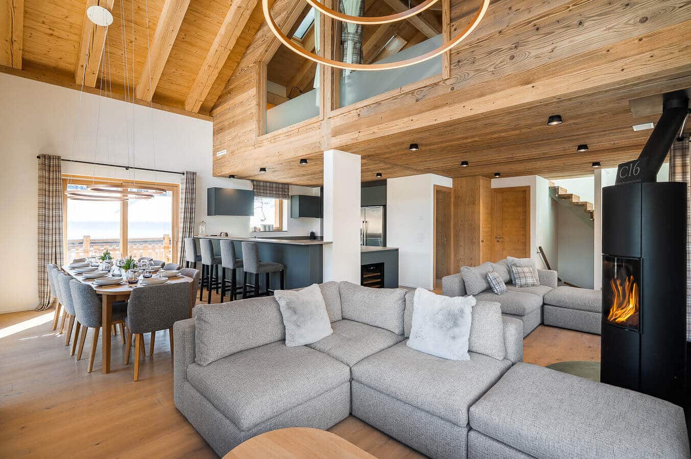 The main living area offers an open plan kitchen, a dining area for 12 guests and a lounge area with a wood stove. There is a large balcony with mountains views. The chalet boasts its private sauna.