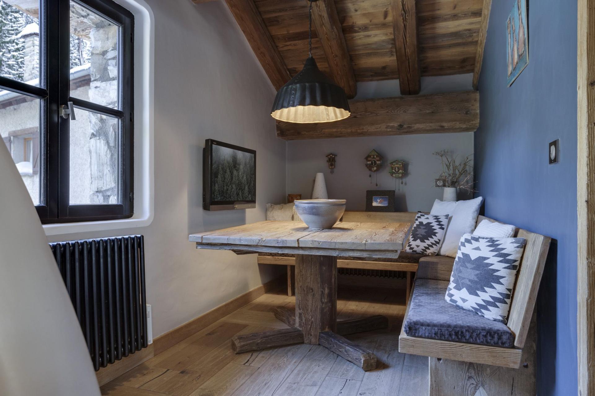 The second floor has one of the most amazing spaces in the chalet, with a large living and dining room that can comfortably accommodate a huge number of guests. With double-height windows, there's a massive amount of light on this landing. There is an enclosed terrace overlooking the river and the boundary mountains of Italy. The large wooden table has ten chairs, and there is also a game or brunch table for four. The log fireplace is the core feature of the room, and there's a big flat-screen TV to catch up on sporting events or just watch a movie.