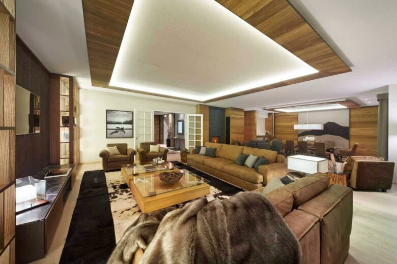 Corvatsch Tower, located in St. Moritz, offers 440m² of accommodation for up to eight guests on its fifth and sixth levels. There is a huge open plan living and dining space with comfortable sofas arranged around a large flat-screen television and a dining table that seats eight. A well-equipped kitchen with steam oven and breakfast bar is opposite the dining area. A sliding door divides the living room from an office/playroom.