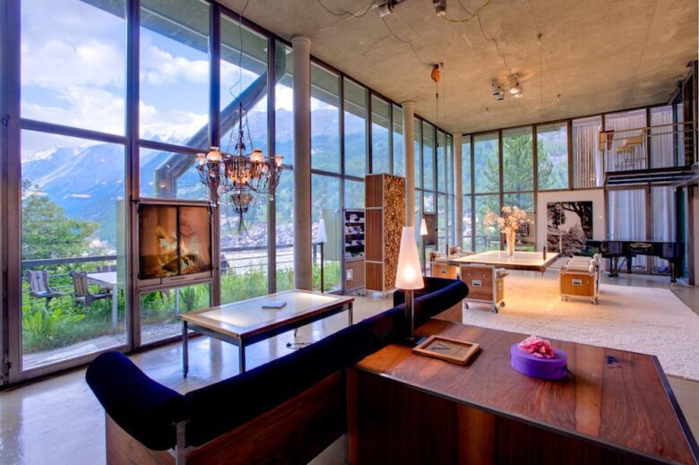Massive 300-metre Manhattan loft-style set in a wooden chalet, the Heinz Julen Loft is without a doubt the most beautiful property in Zermatt. It blends acres of glass, steel, textured concrete, and wood in a complex symphony of fusion architecture created by local star artist Heinz Julen.