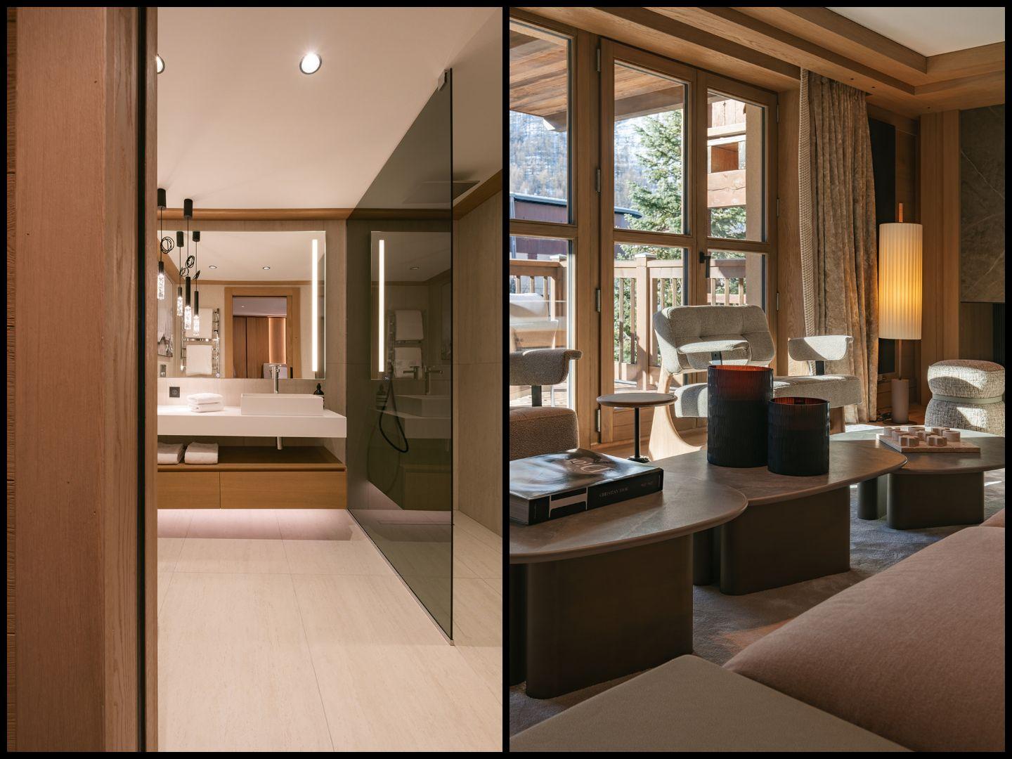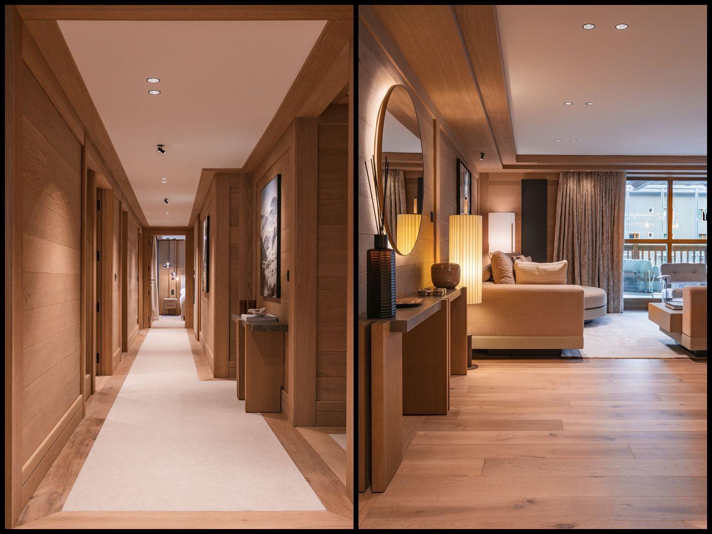 Le Parc Solène in Val d'Isère is an upscale contemporary mountain retreat, nestled in a prime central position within the Le Parc 1963 complex. The generous accommodation can host up to 8 visitors across four elegant bedrooms and serves as an ideal headquarters for those seeking to immerse themselves in the vibrant atmosphere of this sought-after French skiing destination. The primary living space of Le Parc Solène showcases a contemporary open-concept layout, blending sophisticated wooden elements with plush furnishings to create an atmosphere of modern alpine sophistication. A marble hearth commands attention along one wall, infusing warmth throughout the main social area. The radiating comfort from the dancing flames can be enjoyed whether you're unwinding in the sitting area, sharing meals at the sophisticated dining table, or preparing delicacies in the comprehensively equipped kitchen. The lounge extends onto a private terrace, offering views over the principal high street and presenting stunning vistas of the Bellevarde peak beyond the village centre. Le Parc Solène provides accommodation for up to 8 guests, distributed across four double bedrooms with en-suite facilities. The polished, high-end design of these chambers is complemented by the exceptional comfort of the lavish beds. The en-suite bathrooms are expertly appointed, featuring either a spacious walk-in shower or a bath, with the master bathroom boasting both options. The master bedroom additionally benefits from its own private balcony, overlooking the main high street alongside the living area's terrace. Residents of Le Parc Solène enjoy access to the development's shared facilities. These include the 38m² fitness suite, enabling you to maintain peak condition after skiing before returning to the slopes the following day. The Le Parc 1963 complex also provides its own reception, a spacious ski storage area with boot warmers, and dedicated covered parking. The apartment level is accessible via lift. For larger parties seeking proximity, Le Parc Beaumont is also available within the development, accommodating up to 10 guests. Rates are calculated for exclusive apartment use for up to 8 guests and include bed and breakfast service with daily breakfast (2 days continental only), afternoon tea on 5 days, housekeeping on 5 days, and a shared in-resort driver service.BEDROOM & BATHROOM LAYOUT