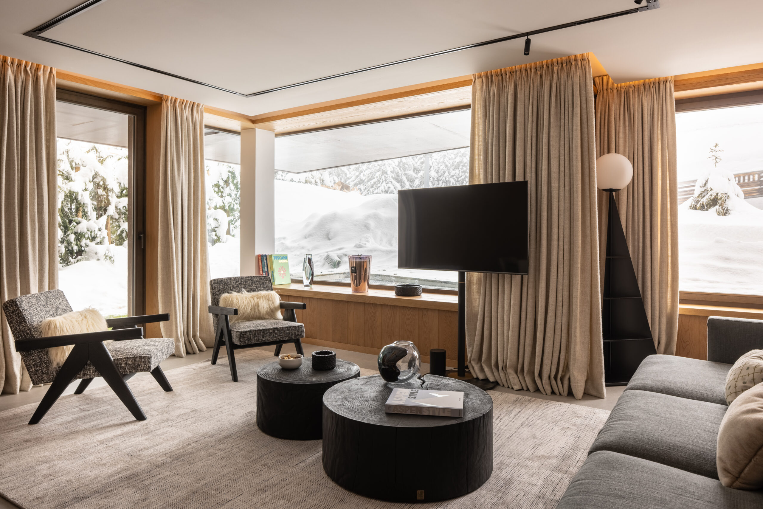Luxurious textured materials paired with natural wooden wall panels create an inviting and modern mountain atmosphere. Accommodating six guests across three double bedrooms, each with its own en-suite bathroom or shower facilities, this Courchevel 1850 residence suits both families and friend groups perfectly.