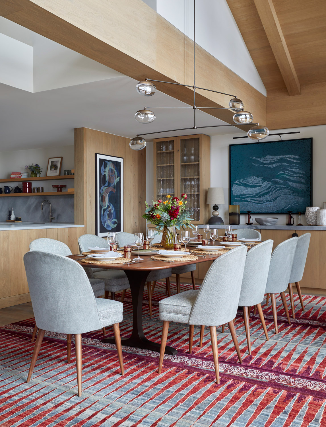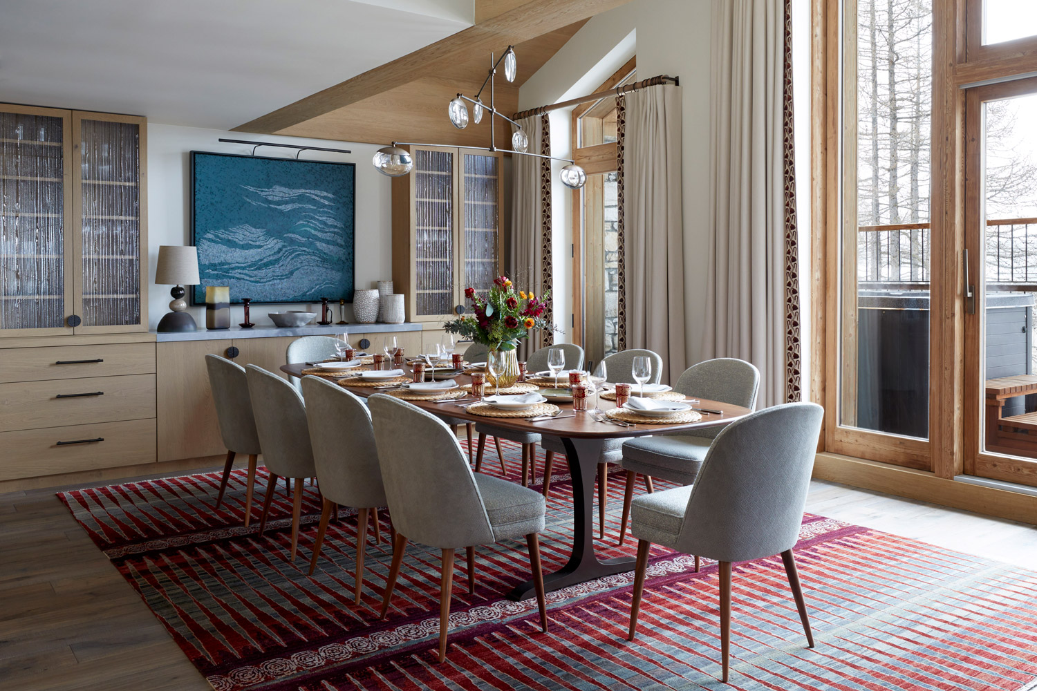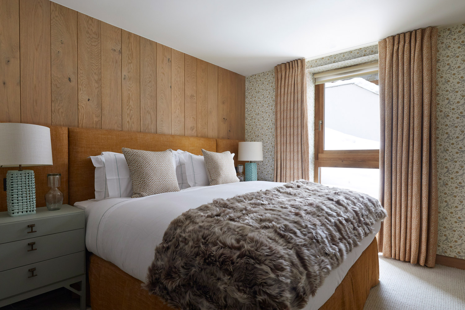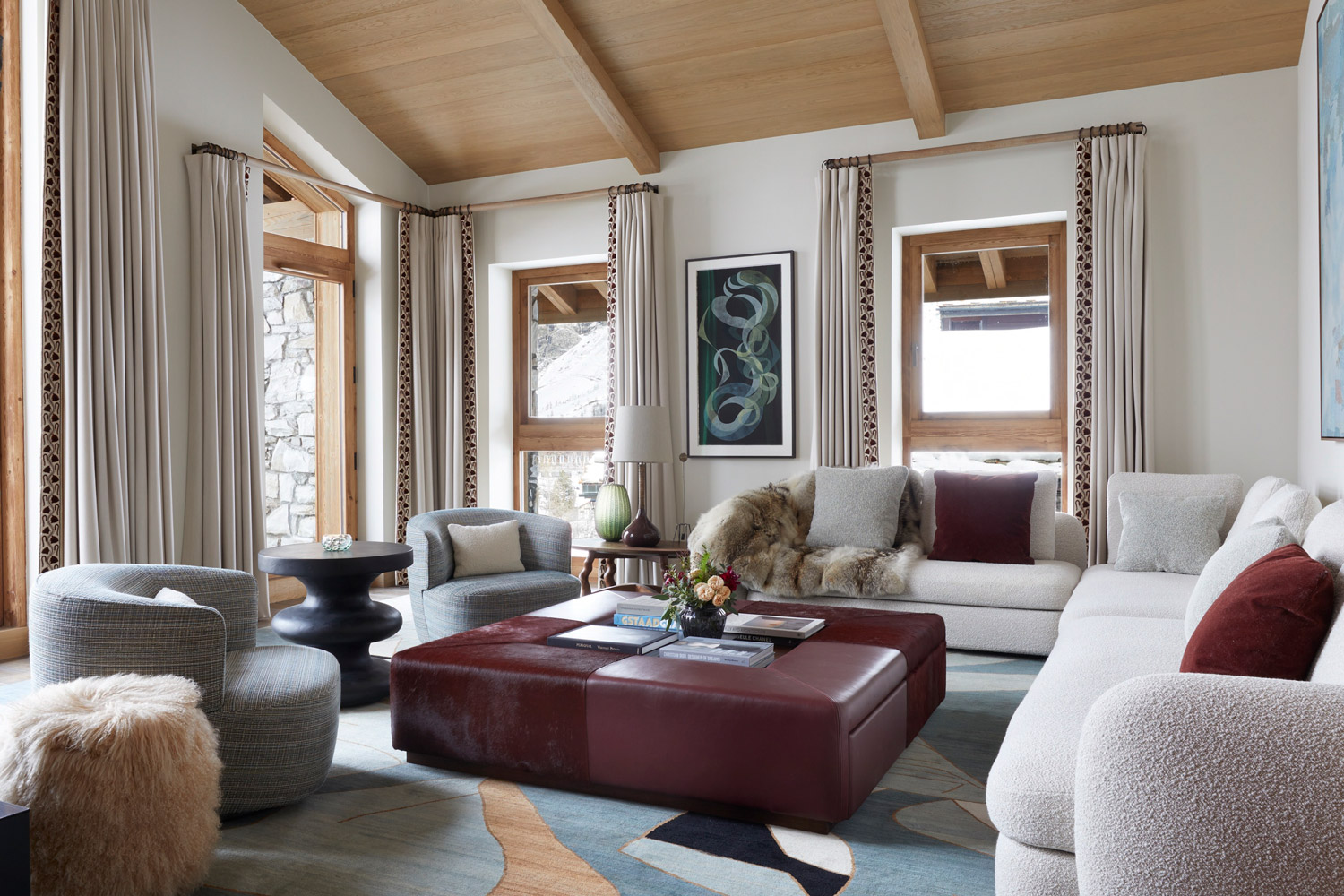 The luxurious interiors of Silverstone Penthouse 4 exude warmth and sophistication, creating an intimate atmosphere perfect for unwinding after a day's mountain adventure. The main living area showcases exposed wooden beams and dark brick walls, harmoniously paired with autumn-inspired décor and furnishings. A stunning fireplace serves as the room's focal point, surrounded by thoughtfully arranged plush sofas and armchairs, maximising the warmth distribution. Elegant golden pendant lights enhance the ambiance. Adjacent to the fireplace stands a spacious dining table accommodating 10 guests. Expansive bay windows frame the snow-covered landscape outside, creating a picturesque backdrop for evening meals. The well-appointed kitchen provides ample space for preparing your own culinary delights on staff-free evenings.