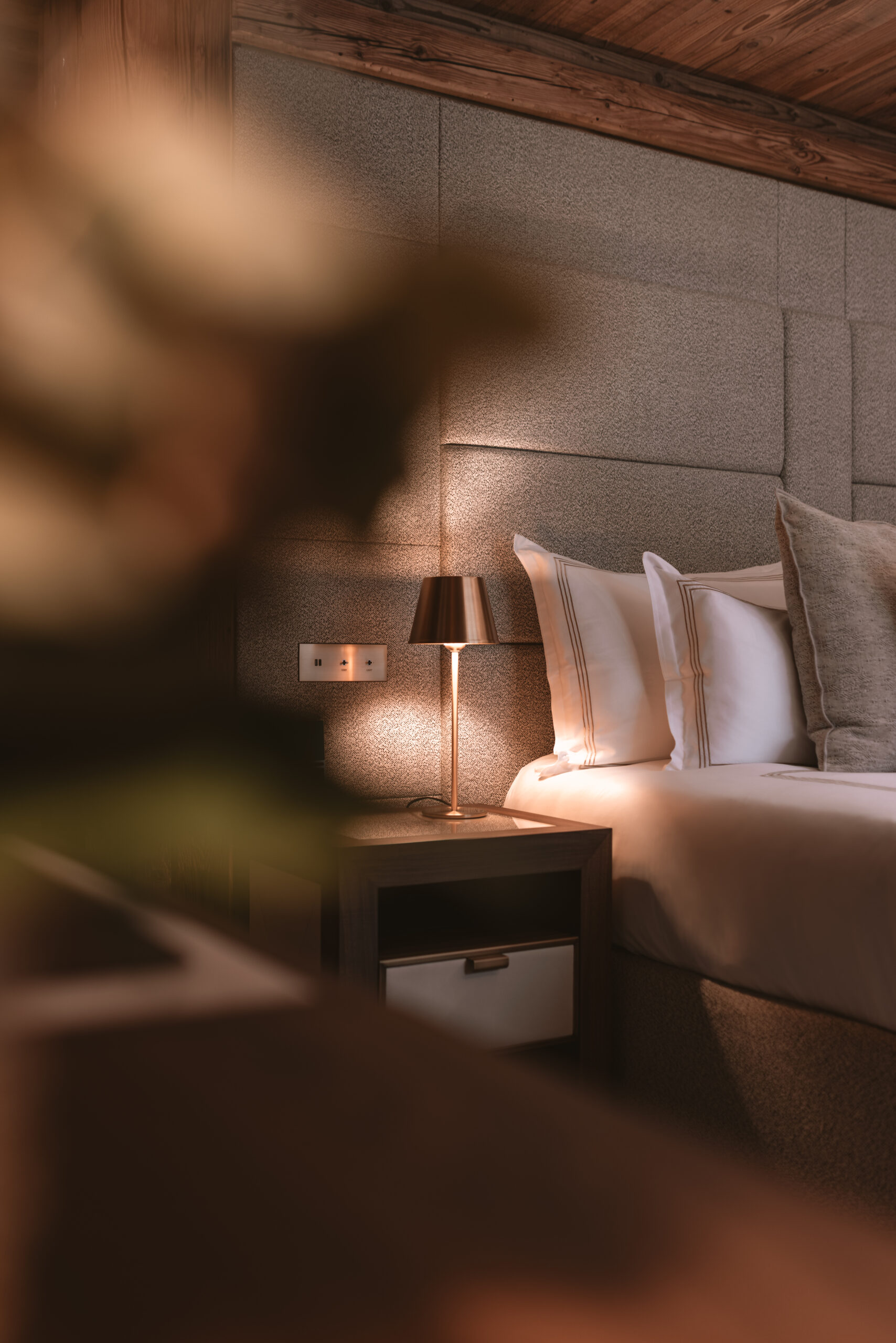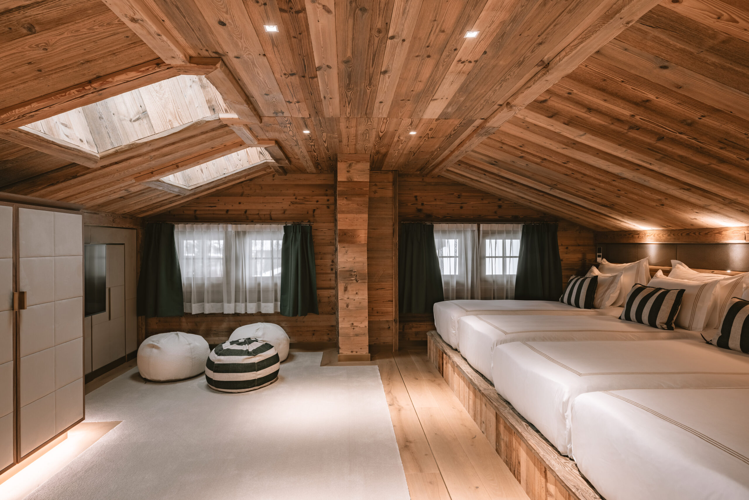 Ultima Gstaad Promenade is ideal for big group ski trips to the Swiss Alps, with 8 spacious double bedrooms and a children's dormitory to accommodate up to 20 people. The apartments are decorated in an alpine elegance style, mixing modern designer furniture with unique hardwood interiors. Each suite has a dressing room and a luxury en-suite bathroom, which frequently includes a bathtub and a shower. The children's dormitory is then positioned on the attic level, with an en-suite shower room and various toilets. One of the bedrooms is accessible to those who have limited mobility.