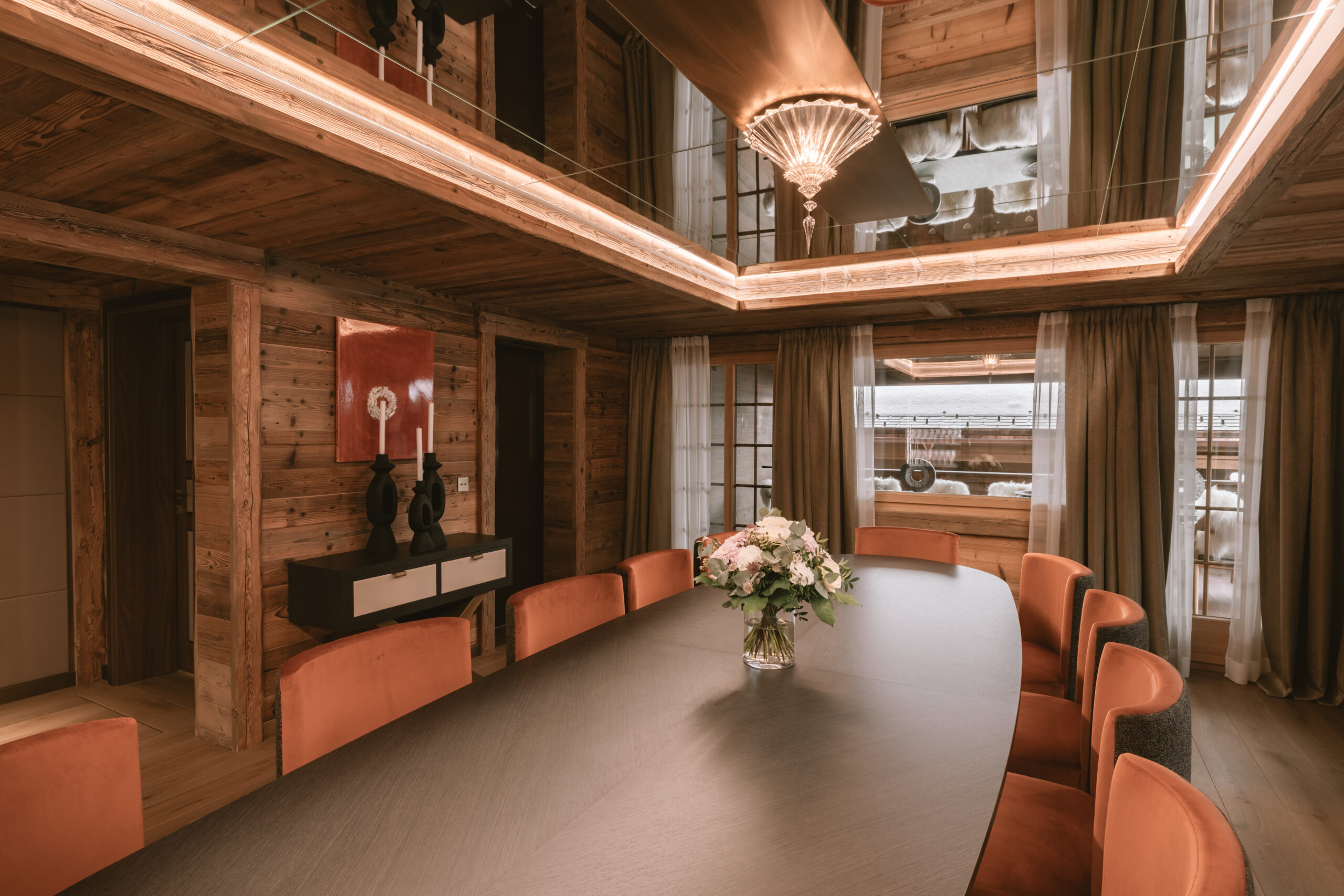 The chalet exteriors have a classic alpine character that complements the essence of the Swiss town of Gstaad. Ultima Gstaad Promenade has four levels and an attic, with the main living rooms on the first floor of the chalet. The chalet's lounge spaces are elegantly decorated in a sophisticated manner with sleek timber furnishings, mirrored ceilings, and sharp design features, creating a sumptuous location for the entire party to mingle. There is a main living room with a fireplace, as well as additional lounge seating in an open-plan area facing the television. The dining area features a similarly stylish style and is located in a separate room on this level from both the lounge and the fully equipped professional kitchen. A wide wraparound balcony allows you to breathe in the fresh mountain air while admiring the beautiful views of the winter hamlet and mountain surroundings.