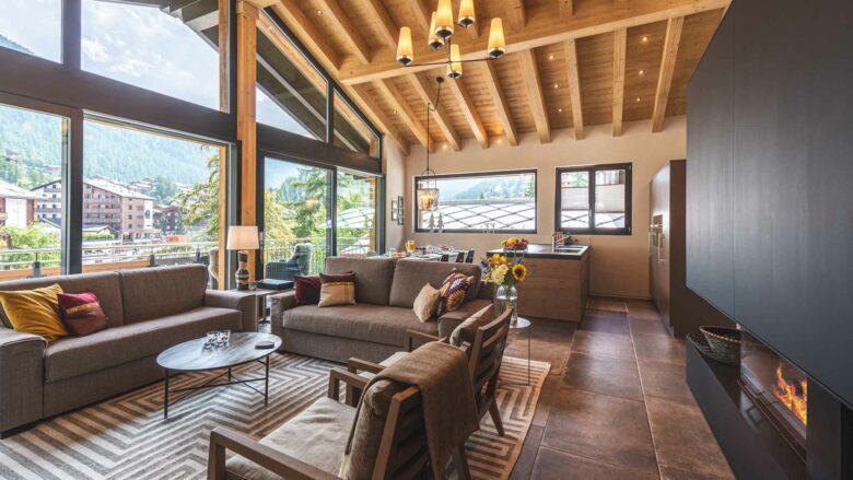 The Walde Penthouse provides luxurious lodging for four guests, featuring a living and dining area with generously sized sofas, an expansive table, and ample dining seating to host guests and embrace a more refined lifestyle than typical four-person apartment. The striking double-height windows, stretching from floor to ceiling, capture a view so distinctively Zermatt that you'd instinctively reach for your climbing gear and tighten your mountaineering boots. The streaming river flows below, whilst across the valley, larch-clad hillsides and the Gornergratbahn railway climbing towards Riffelalp catch your eye, with countless peaks visible until the majestic Matterhorn comes into view. The iconic Horn maintains its commanding presence throughout.